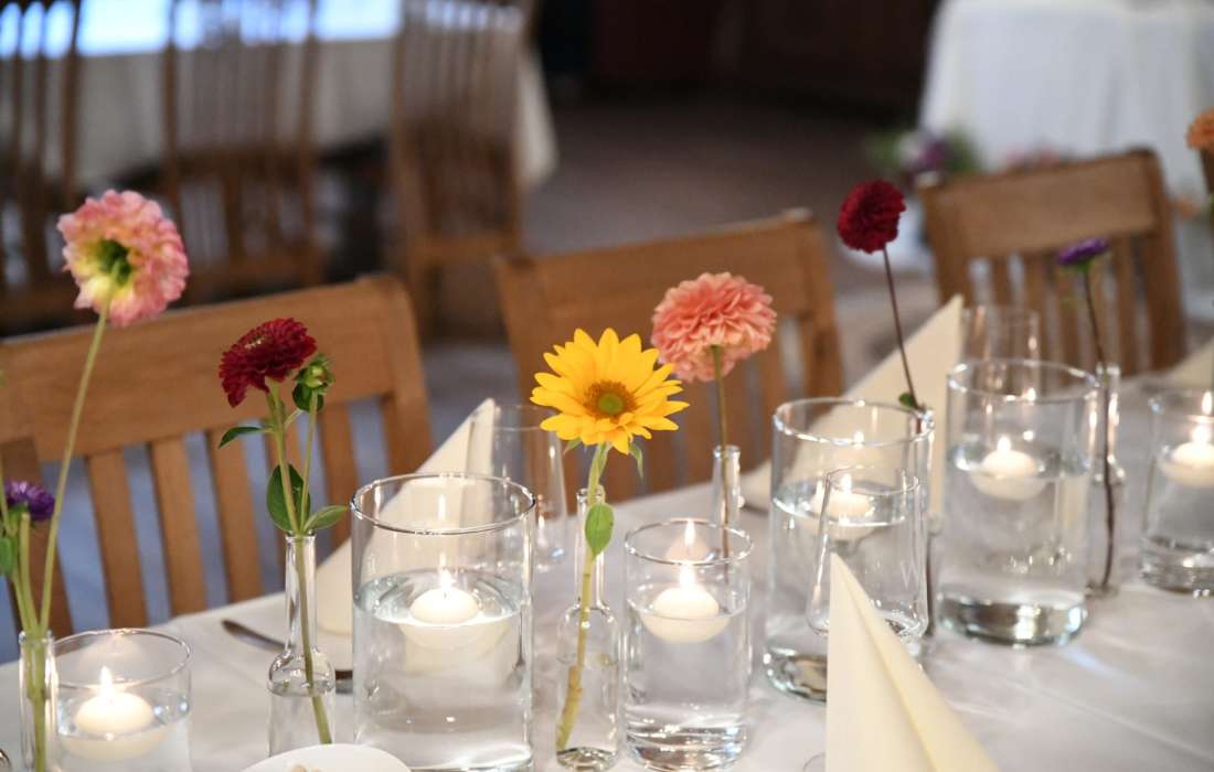 Eine wunderschöne Tischdekoration mit bezaubernder, frischer Floristik wird Eure Feier märchenhaft gestalten.