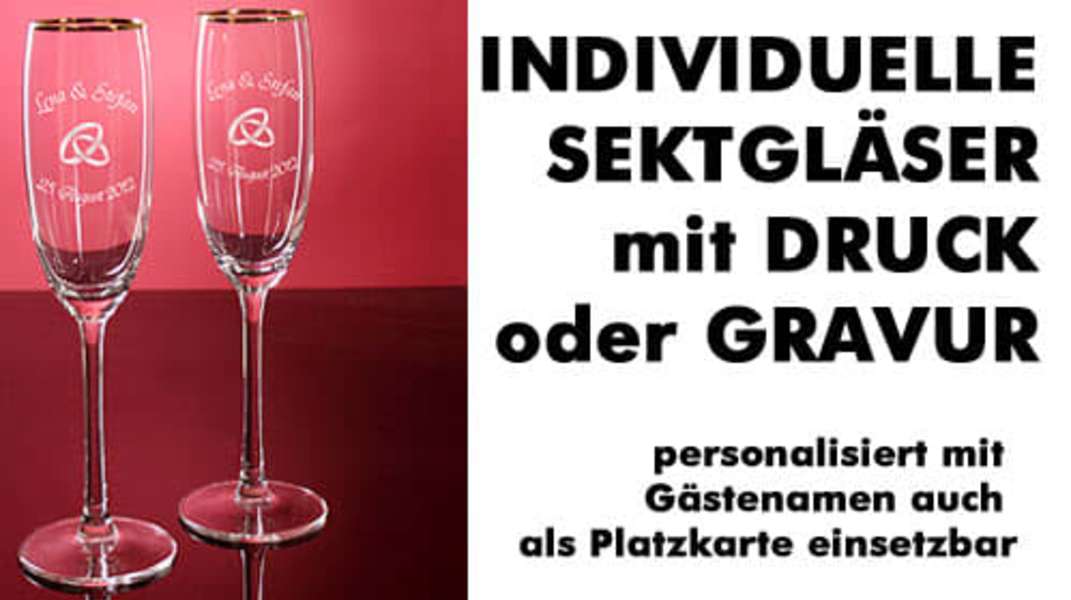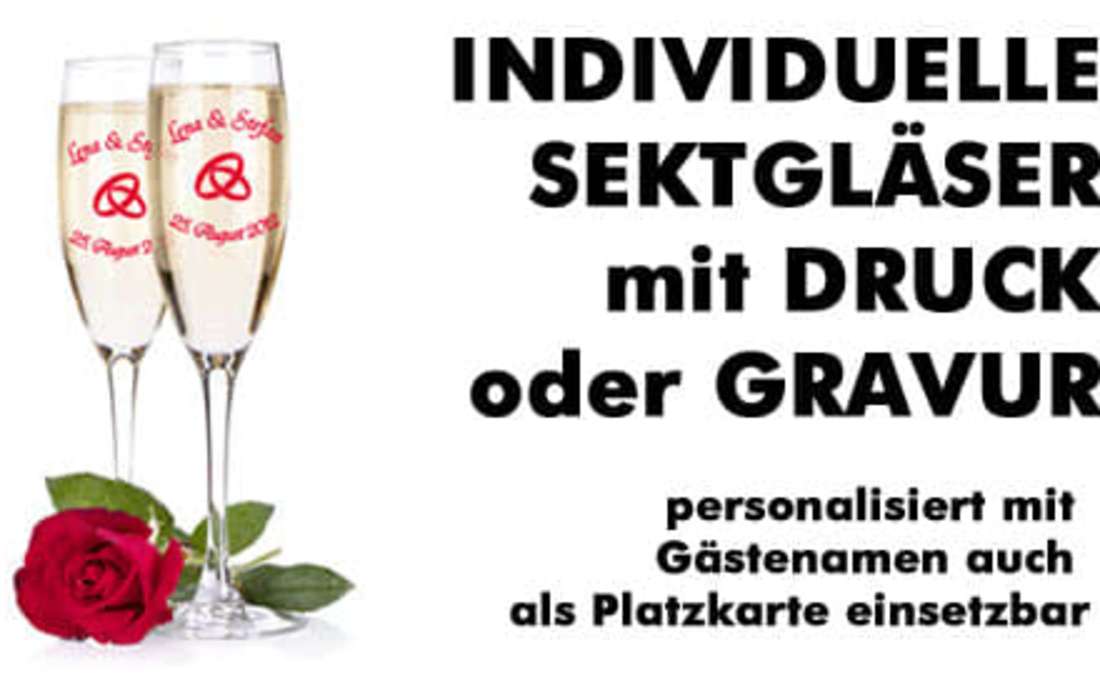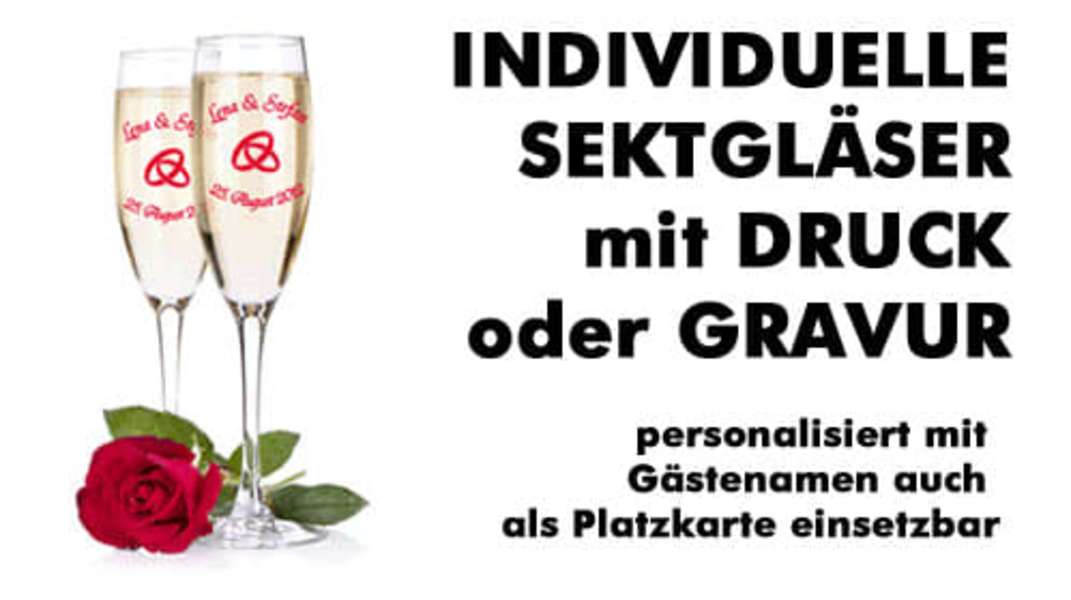 Wählen Sie aus unserem großen Angebot an Sektgläsern, Champagnergläsern, Weingläsern, Schnapsgläsern, Marmeladengläsern und vielen weiteren ausgefallen Produkten. Individuelle Gravuren für Ihre Hochzeit, als Gastgeschenk zur Hochzeit, Goldenen Hochzeit, Silberhochzeit und vielen weiteren Gelegenheiten.