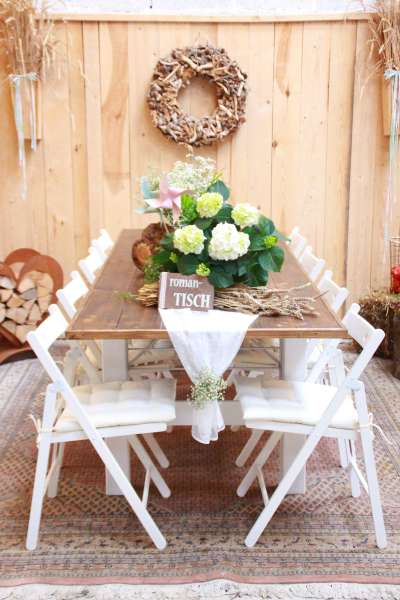 Verleih von Tischen, Stühlen & Deko im rustikalen Vintage-Stil