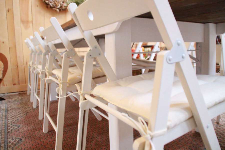 Unsere Tische sind handgearbeitet, klappbar und haben eine Größe von 254 x 94 cm. Die dunkle Holzplatte ist ein toller Kontrast zu den weißen Holzbeinen und Stühlen und wirkt gleichzeitig sehr edel. So passen unsere Tische wunderbar zu einer Hochzeit!