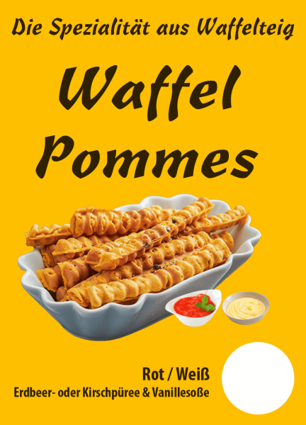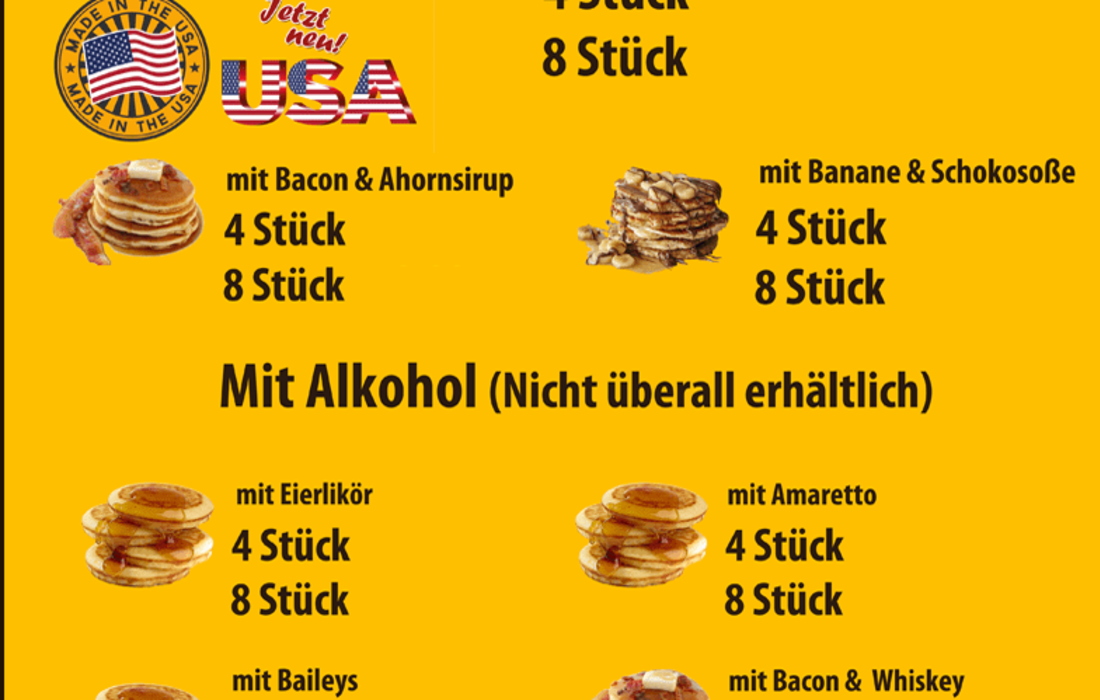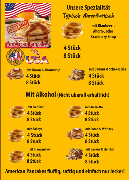 Unsere Spezialitäten sind American Pancakes, Belgische Waffeln und Waffel Pommes (Rot/Weiß).