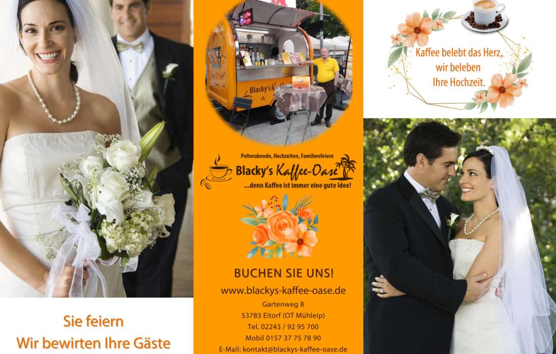 Eine Hochzeit ist ein besonderes Ereignis im Leben eines Paares und sollte daher mit besonderen Details zu einem unvergesslichen Erlebnis werden. Blacky’s Kaffee-Oase kann eine besondere Note für Ihre Hochzeit setzen und für einen entspannten Start in den Tag sorgen.