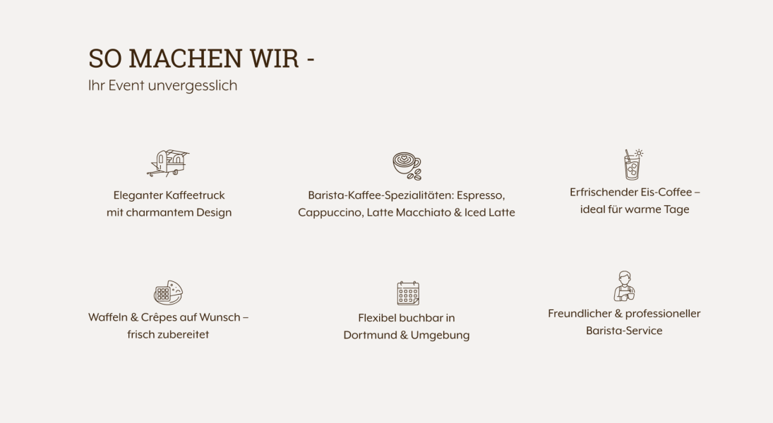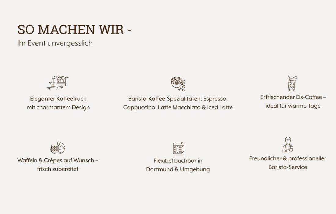 Mit unserem stilvollen Coffee Truck verwöhnen wir Dich und Deine Gäste mit frisch gebrühtem Kaffee in Barista-Qualität sowie mit frisch zubereiteten Crêpes und Waffeln.