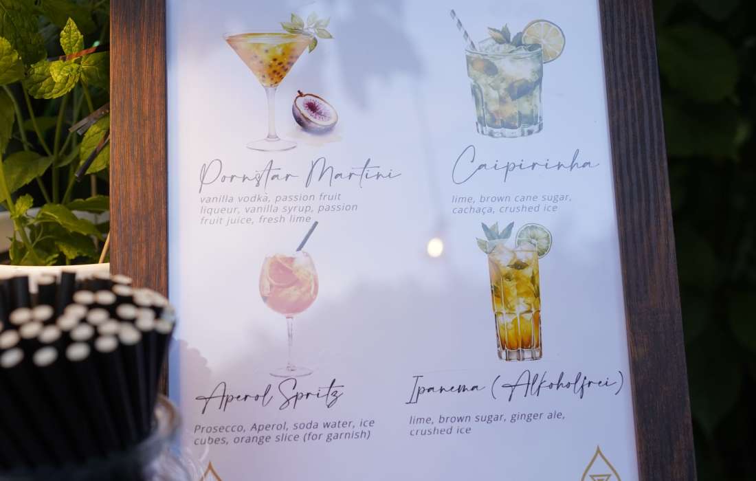 Vielseitige Cocktailauswahl: Von Klassikern wie Mojito oder Mai Tai bis hin zur individuellen „Eigenkreation“ für Ihr Event – alkoholfreie Optionen inklusive.
