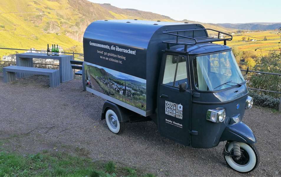 Das vinophile Schätzchen, eine zur mobilen Vinothek umgebaute Piaggio Ape, ist ein Eyecatcher, optisch ist sie ein Hingucker und da alles praktisch verfügbar ist, ist sie gut geeignet für den flexiblen mobilen Genuss von Rieslingen aus den Steilstlagen rund um Ürzig.
