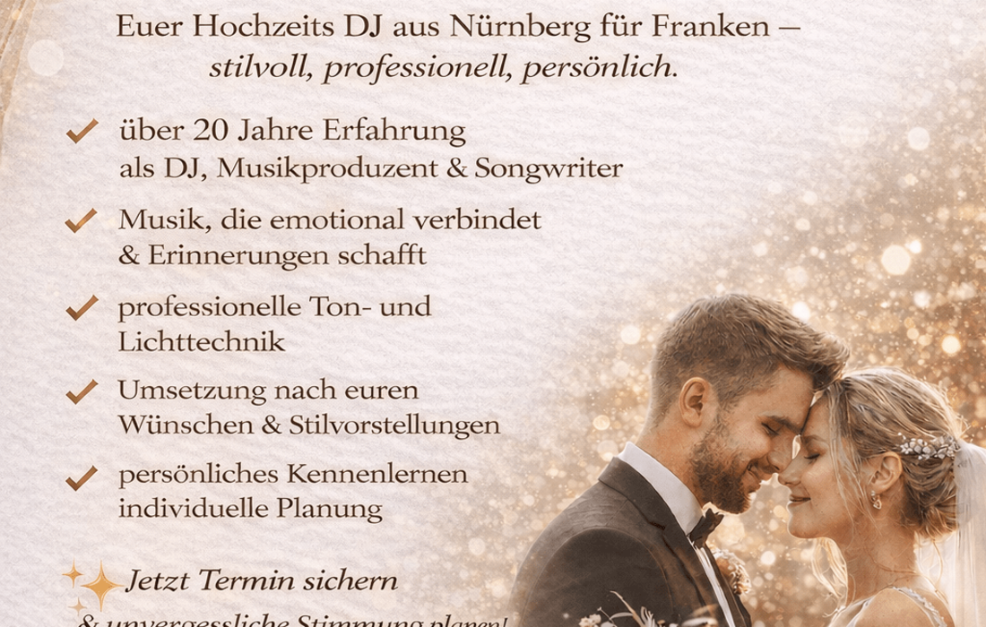 Am großen Tag könnt ihr euch entspannt zurücklehnen – ich kümmere mich um den musikalischen Ablauf, den Sound und die Stimmung, die euch und eure Gäste den ganzen Abend trägt.