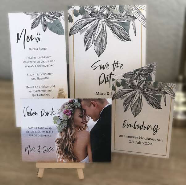 Unsere Grafiker sind Spezialisten und können Eure Wünsche direkt umsetzen. Die Designs der Karten sind so individuell und einmalig wie Eure Hochzeit. Somit unterscheiden die Karten sich stark von der Massenware, sind aber nicht teurer.