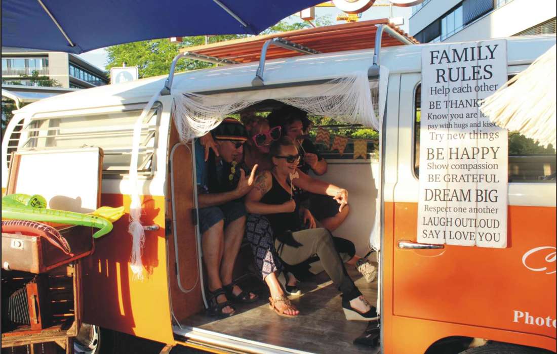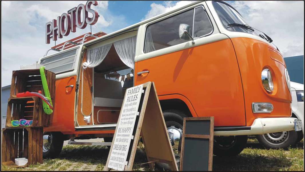 Der Photobus bringt gute Laune, die durch die vielen verschiedenen Requisiten noch verstärkt wird. Wenn sich jeder vor dem Bus verkleidet, ist der Lacher vorprogrammiert.