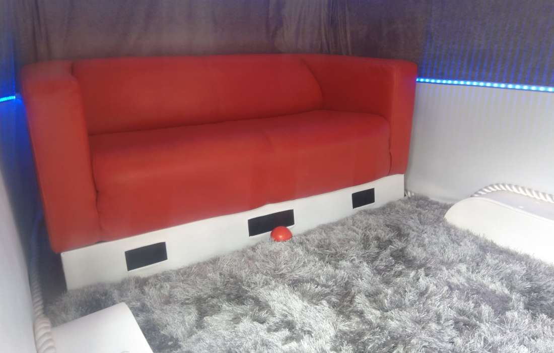 Ein Soundsystem mit Alexa Steuerung eingebaut sowie eine Minibar.