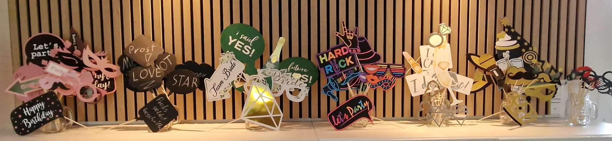 Mit unseren zahlreichen Requisiten können Ihre Gäste tolle Bilder entsprechend dem Motto Ihrer Veranstaltung machen. Speziell für Hochzeiten haben wir auch Karten mit Fotoaufgaben die garantiert keine Langeweile aufkommen lassen.