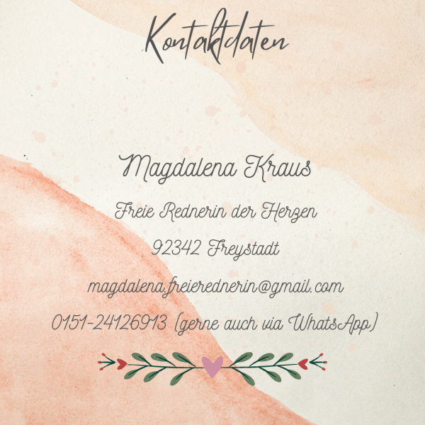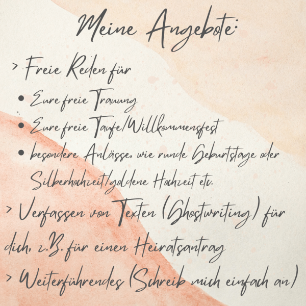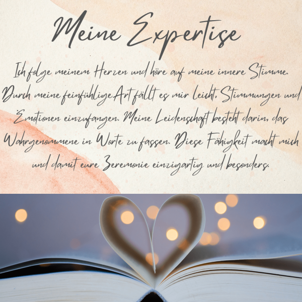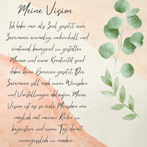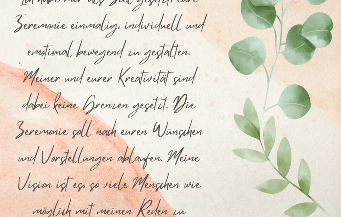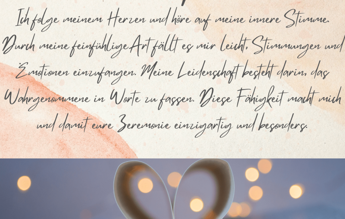 Meine Vision ist es, eure Gäste an eurer gemeinsamen Liebe an eurem ganz besonderen Tag teilhaben zu lassen. Ich schaffe für alle in meiner Umgebung eine Wohlfühlatmosphäre und möchte mit euch und euren Liebsten damit eine gelungene, gefühlvolle und energiereiche Zeremonie gestalten.