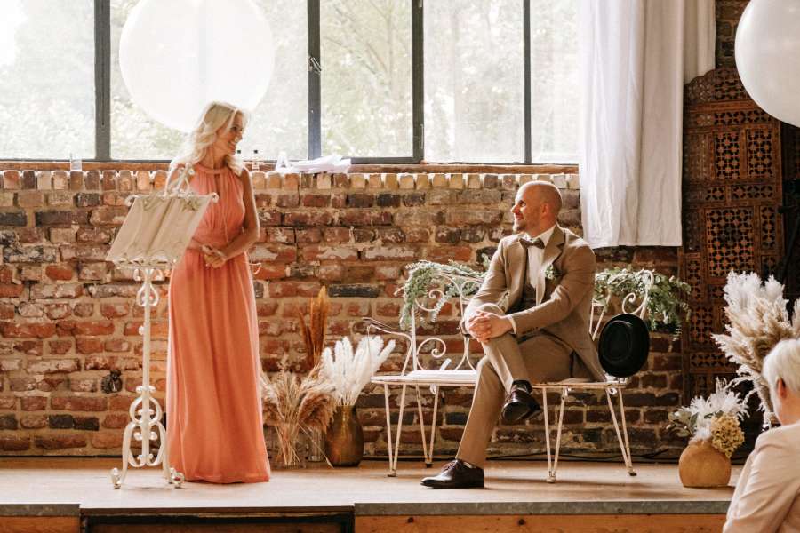Nachdem wir auf einer Hochzeit von Verwandten die liebe Nicole als Rednerin live erleben durften, war uns klar, wenn wir mal heiraten, werden wir Nicole anfragen! Und so kam es auch. Bereits die erste Kontaktaufnahme war so herzlich, dass wir kein weiteres Kennenlernen brauchten und sie direkt buchten. Bei unserem Vorgespräch für die Trauung verbrachten wir einen tollen Tag mit Nicole, wir lernten uns gegenseitig kennen und sie schrieb aufmerksam Infos über uns auf. Im Anschluss holte sie sich noch zusätzlich Infos zu uns bei unserer Familie und Freunden ein, was wir im Nachhinein erst erfahren haben. Sämtliche Kommunikation mit Nicole lief reibungslos, sie beantwortete uns direkt alle Fragen und gab uns viele nützliche Tipps zur Trauung an die Hand. Am Hochzeitstag kam sie bereits früh in der Location an und sprach sich mit unserer Sängerin ab, sodass wir reibungslos mit der Trauung starten konnten. Dankenswerter Weise erklärte sich sogar ihr Mann spontan bereit, mich als Braut ein Stück vom Hotel zum Trauort zu fahren, sodass ich den weiteren Weg nicht laufen musste. Zur Trauung bleibt uns nicht mehr zu sagen als einfach WOW! Nicole hat alle wichtigen Infos über uns in einer tollen Rede niedergeschrieben, romantisch, aber auch sehr humorvoll! Es sind nicht nur Tränen der Rührung, sondern auch Tränen der Freude gelaufen. Jeder Gast fühle sich unterhalten und es machte unheimlich Spaß Nicole bei der Rede zuzuhören! Auch wenn wir uns Wochen später noch die Rede durchlesen, sind wir jedes Mal aufs Neue ergriffen. Da ich beruflich als Hochzeitsplanerin arbeite und schon einige Trauredner*innen auf Hochzeiten erlebt habe, kann ich nur sagen, Nicole ist wirklich eine spitzen Rednerin! Es war die beste Entscheidung Nicole als unsere Traurednerin zu buchen und wir können sie nur wärmstens weiterempfehlen! Herzlichen Dank liebste Nicole, dass du unsere freie Trauung zu so einem unvergesslich schönen Ereignis in unserem Leben gemacht hast! Wir sind die sehr sehr dankbar für deine Rede und dich als so herzlichen Menschen!