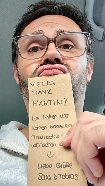 Lieber Martin, du hast unsere Trauung mit deiner humorvollen und professionellen Art sehr bereichert. Mit deinem entspannten Auftreten hast du eine Wohlfühlatmosphäre für uns und unsere Gäste geschaffen und dabei eine wundervolle Traupredigt gehalten. In uns hast du damit viel Vorfreude auf das Abenteuer der Ehe geweckt. Wir sind dankbar und schwelgen gerne in Erinnerungen.