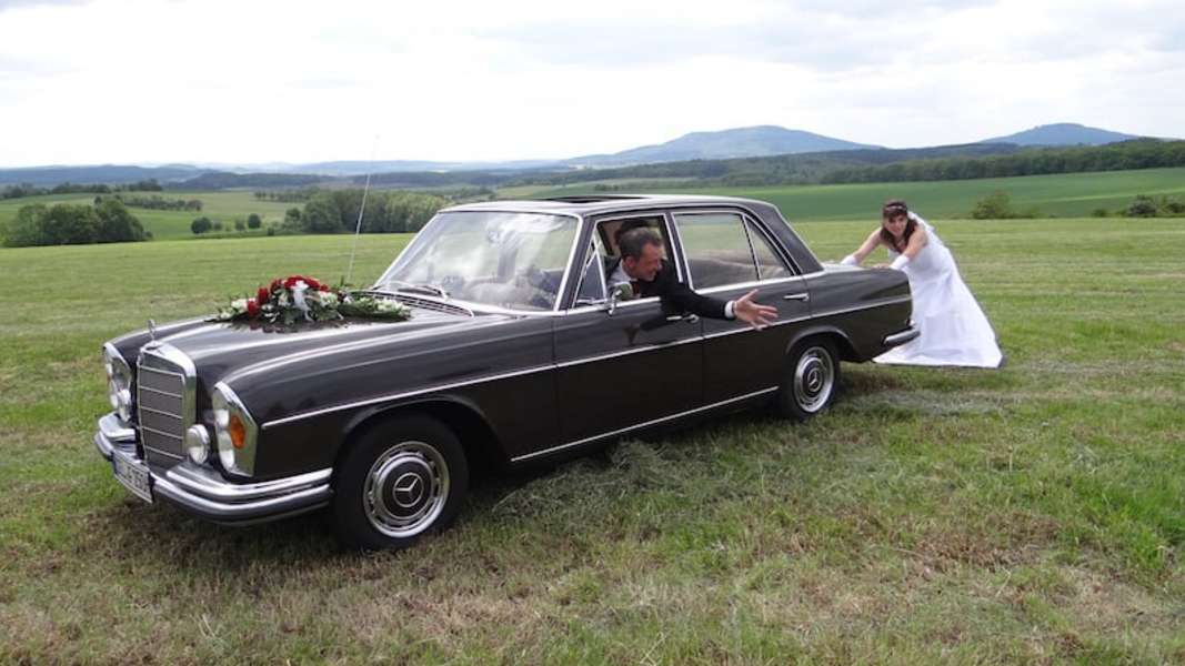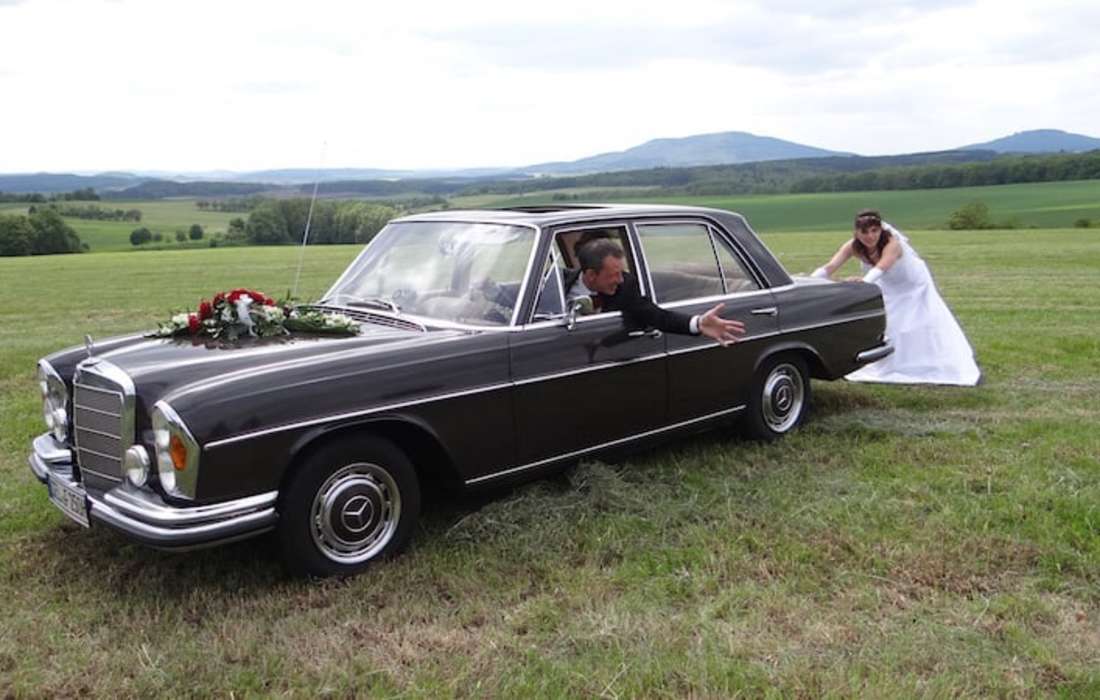 Mercedes 250 S, lässig, komfortabel, zugelassen für 6 Personen, mit einem einmaligen, "metallisch hämmernden" 6-Zylinder-Sound. Der klassische, stilvolle Oldtimer.