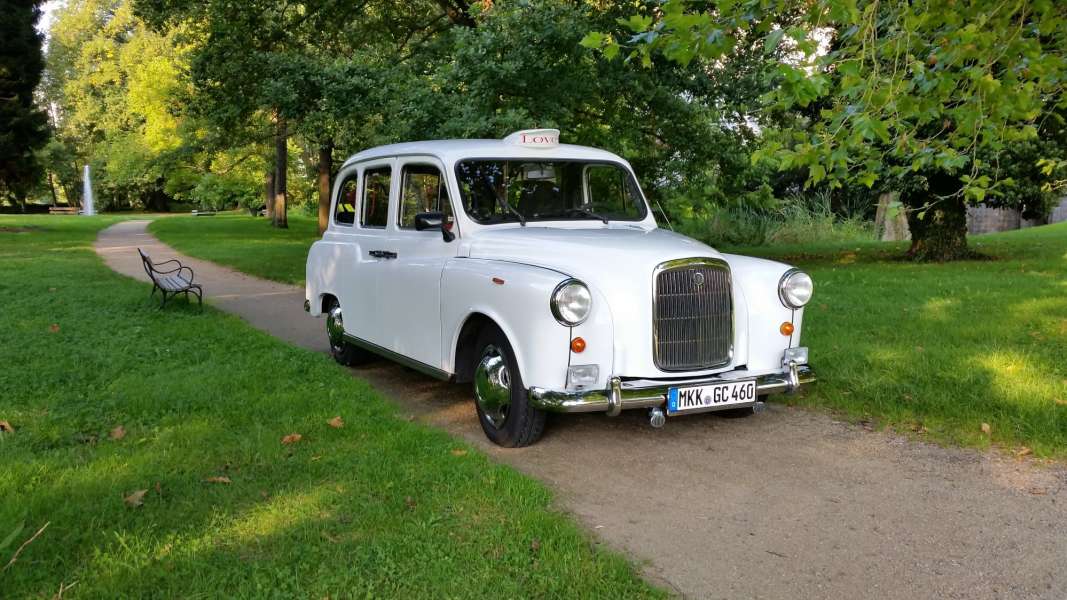 Dieses seltene klassische Fairway London Taxi ist mit seiner strahlend weißen Karosserie, den umfangreichen verchromten Armaturen einschließlich seiner alten Chromstoßstangen das absolut ideale Hochzeitsauto. Die sich weit öffnenden Türen ermöglichen ein unkompliziertes Ein- und Aussteigen. Der große Innenbereich, vor allem auch dessen Höhe, ist einer Limousine gegenüber im Vorteil. Weder der Zylinder des Bräutigams noch die kunstvoll gesteckte Hochfrisur der Braut werden zu einem Problem.