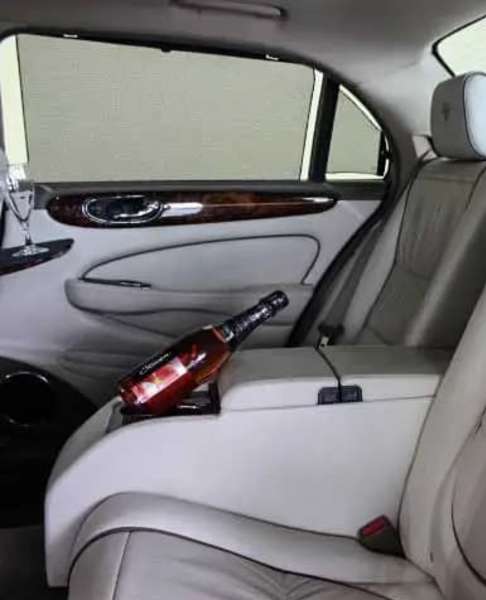 Die hellen komfortablen Ledersitze mit ausklappbaren Tabletts und Flaschenhalterung bieten den idealen Rahmen für Brautpaare.