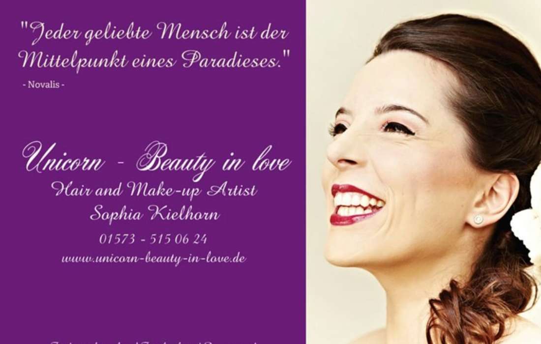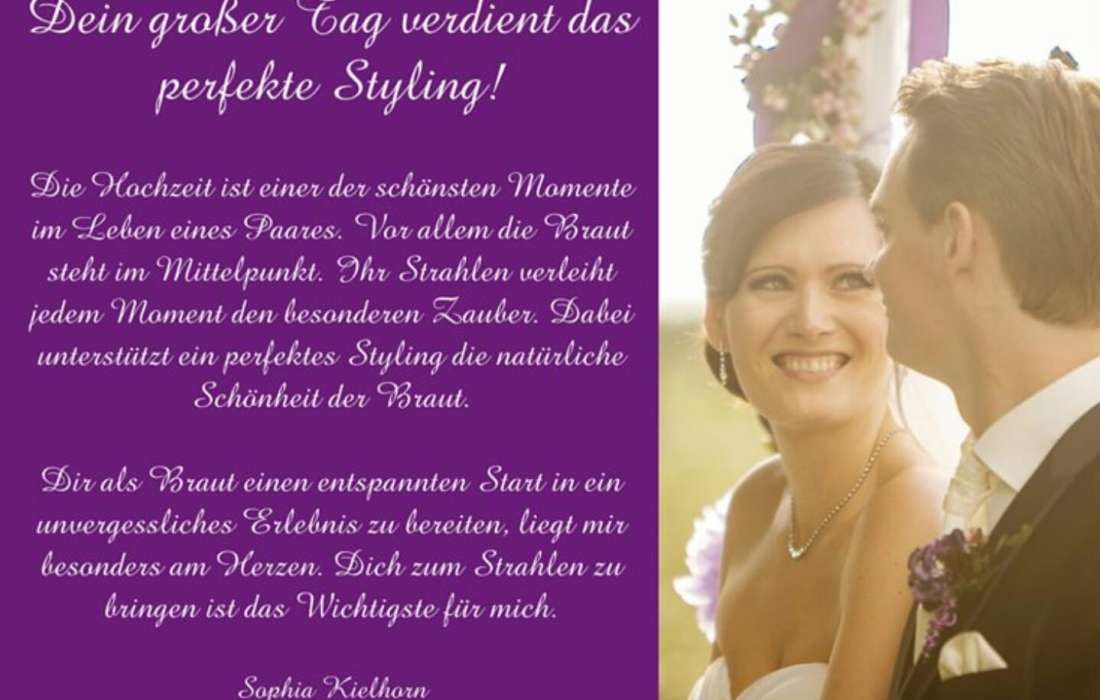Das ist Dein Tag. Und du möchtest umwerfend aussehen. Dein Lächeln bringt das Strahlen, für das perfekte Styling sorge ich. Dabei stehen deine Wünsche im Vordergrund. Der Probetermin ist inklusive. Für den Probetermin komme ich gern zu dir nach Hause. Ich plane dafür 2,5 Stunden ein. Wir besprechen deine Wünsche und gehen alles Schritt für Schritt durch. Am Tag deiner Hochzeit komme ich genau dort hin, wo du mich brauchst. Ich plane 2 Stunden für den Hochzeitstag ein. Ich style gern auch deine Mutter, Schwiegermutter, Trauzeugin, Freundin oder das Blumenkind. Auf Wunsche kümmere ich mich auch gern um das Styling deines Bräutigams. Schau gern auf meiner Homepage vorbei. Ich freue mich auf eine Nachricht von dir. Schöne Grüße, Sophia Kielhorn.