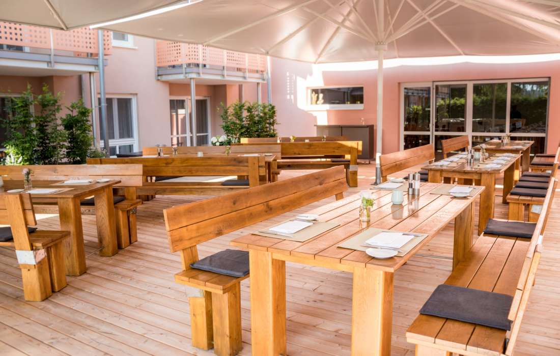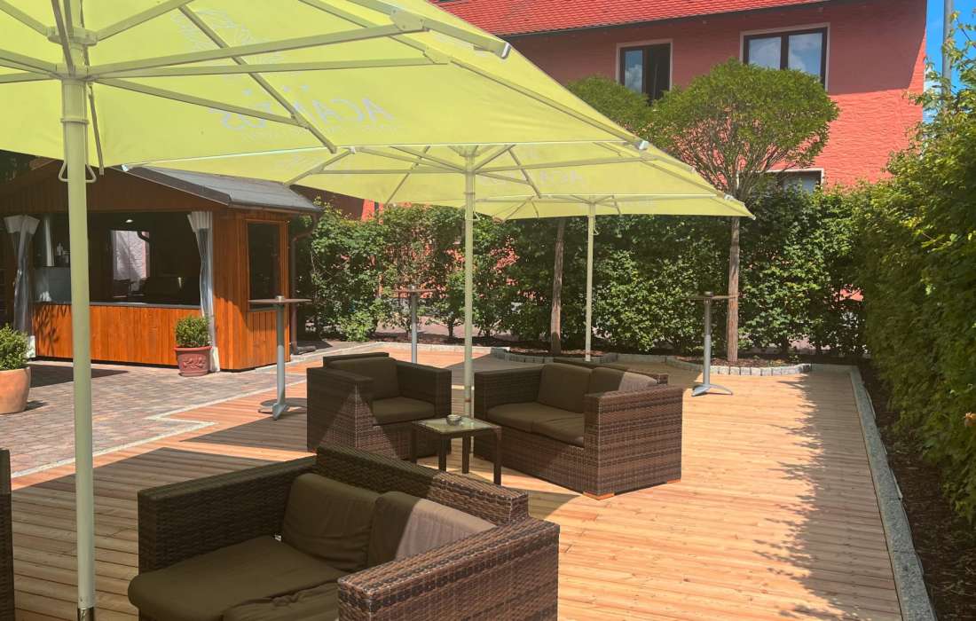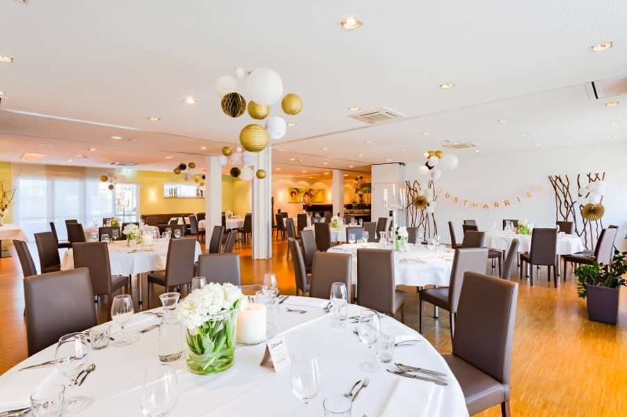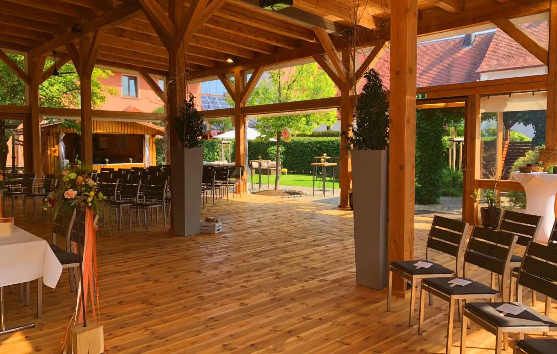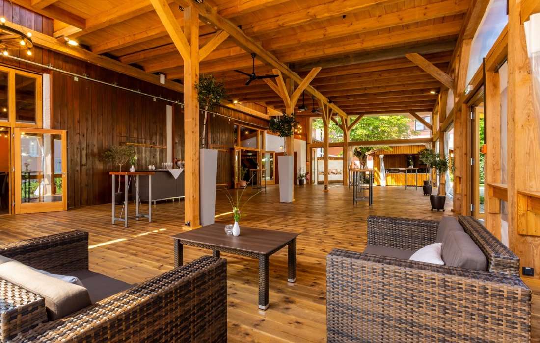 Unser klimatisierter Bankettsaal ist mit seinem eleganten Ambiente und seiner direkt anschließenden großen Holzterrasse ebenfalls eine Traumlocation für Ihren großen Tag! Hier werden zusätzlich zu den Klimaanlagen Luftreinigungsgeräte eingesetzt, die bis zu 4.800 m³ Luftvolumen pro Stunde reinigen.
