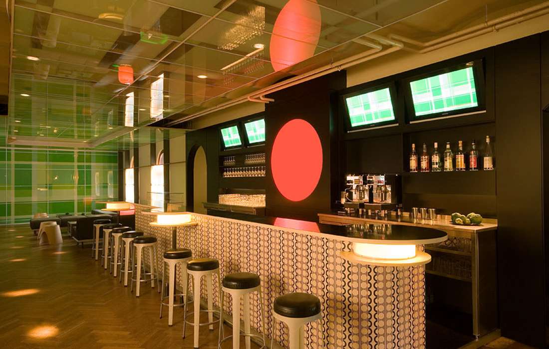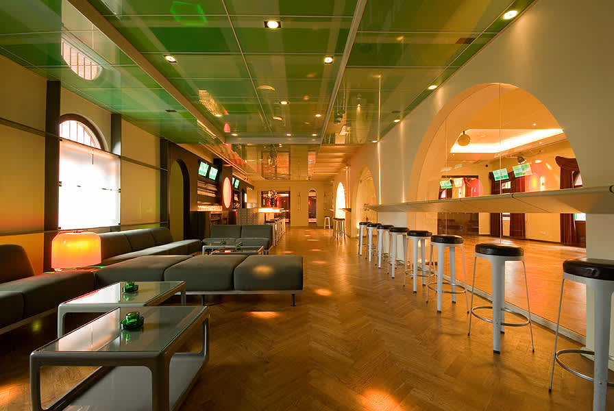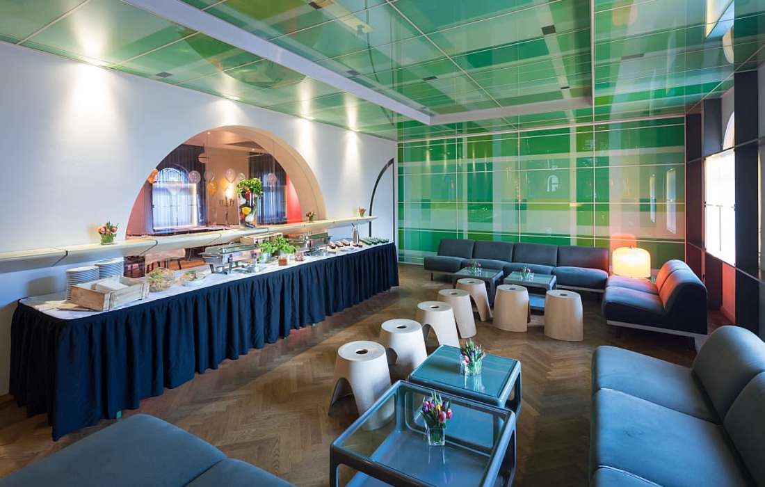 In unserer modernen Retro-Lounge in orange-grün können Eure Gäste in bester Bar-Atmosphäre auf Euer Glück anstoßen – und flanieren durch den Garten- & Spiegelsaal, die das Raumensemble ergänzen.