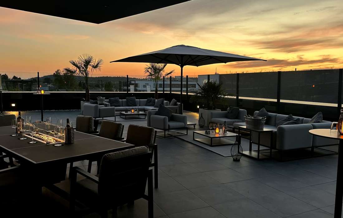 Die gesamte Räumlichkeit ist lichtdurchflutet durch bodentiefe Fenster und eine zentrale Lichtkuppel. Sie genießen Weitblick ins Grüne inklusive traumhafter Sonnenuntergänge.