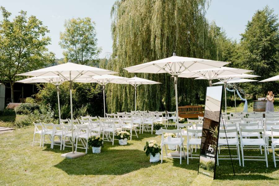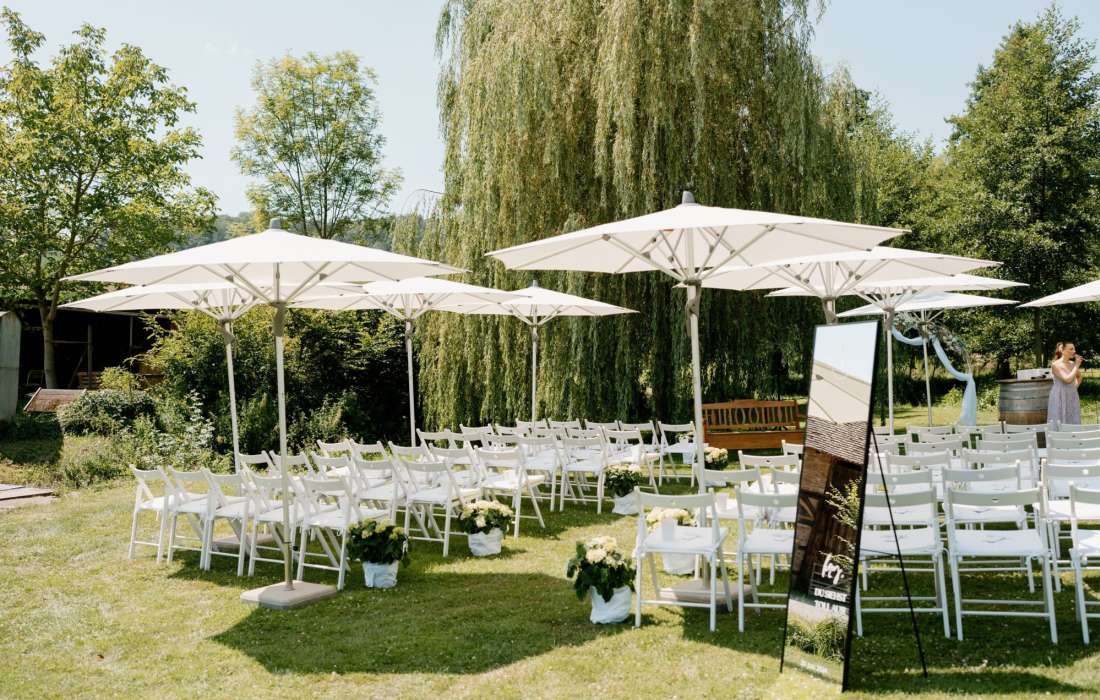 Im Steinbachhof scheint zwar fast immer die Sonne - falls es dennoch einmal regnen sollte, können wir Ihre Trauung und alle sonstigen geplanten Aktivitäten problemlos auch indoor realisieren. Ihnen entstehen dabei selbstverständlich keine Mehrkosten.
