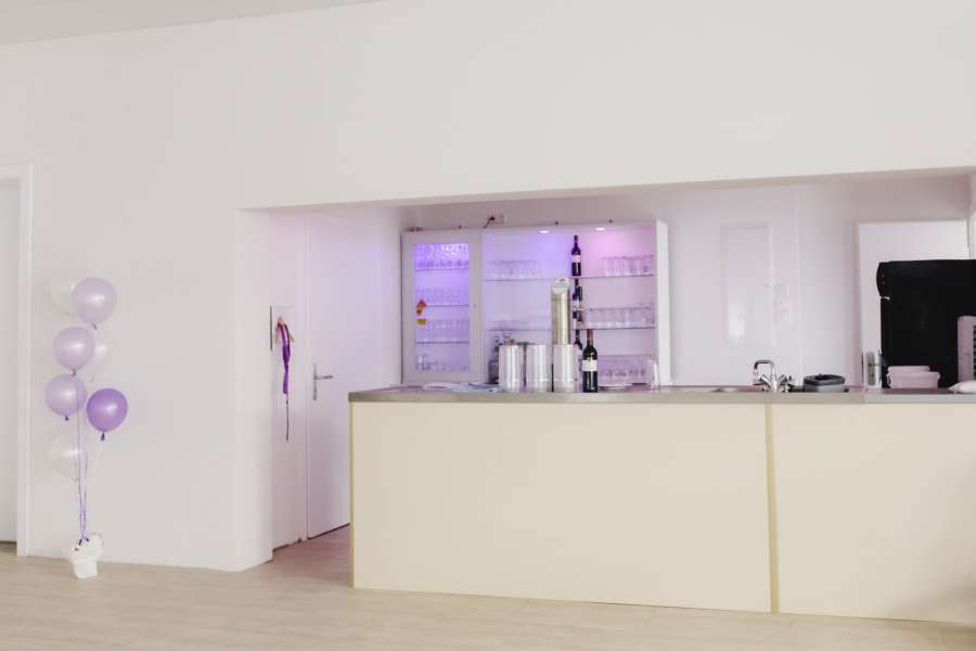 Ein erhöhter, offener Thekenbereich mit Schanktisch grenzt an den Saalbereich an. Die Schanksäule ist mit zwei Zapfhähnen ausgestattet. Die darunterliegende Bierkühlung eignet sich für 20l bis 50 l Fässer. Für die Flaschenkühlung stehen vier Schubfächer und ein Flaschenkühlschrank mit Glastür zur Verfügung. Es gibt einen elektronischen Gläserspüler. Angrenzend ist der 20 qm große Raum zur Präsentation von Büffets bestens geeignet.