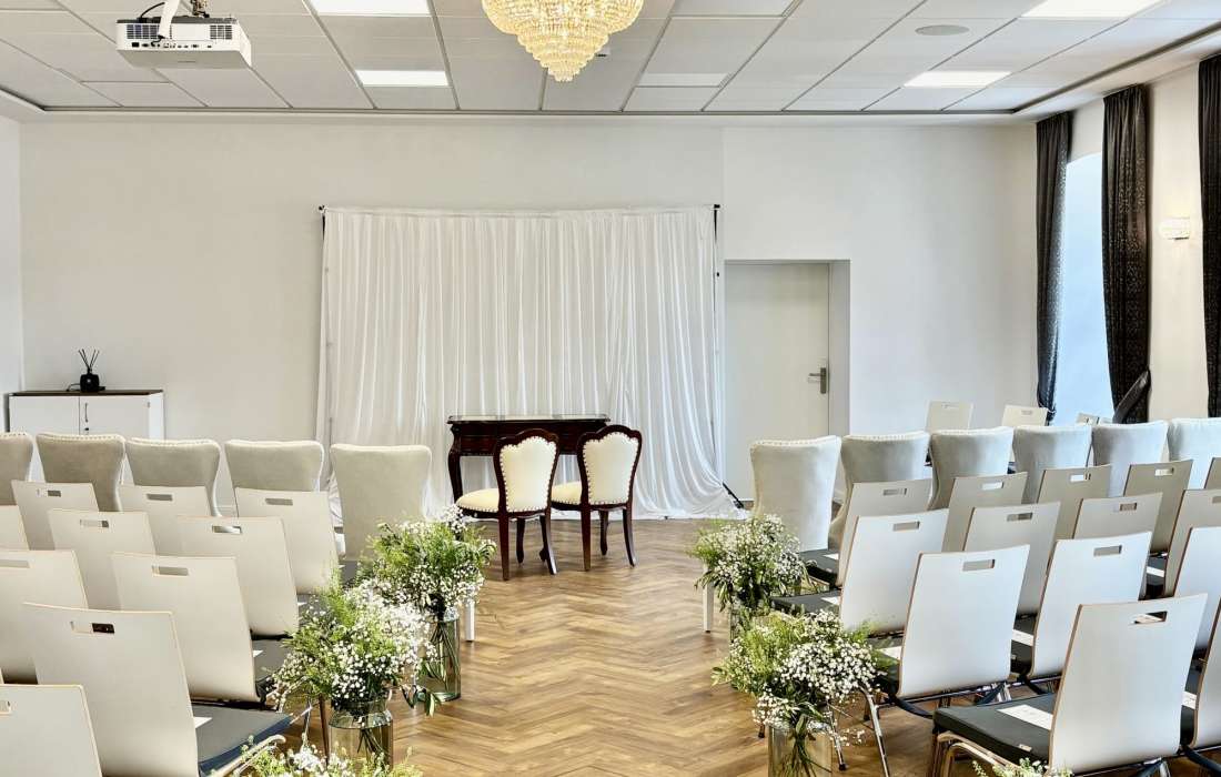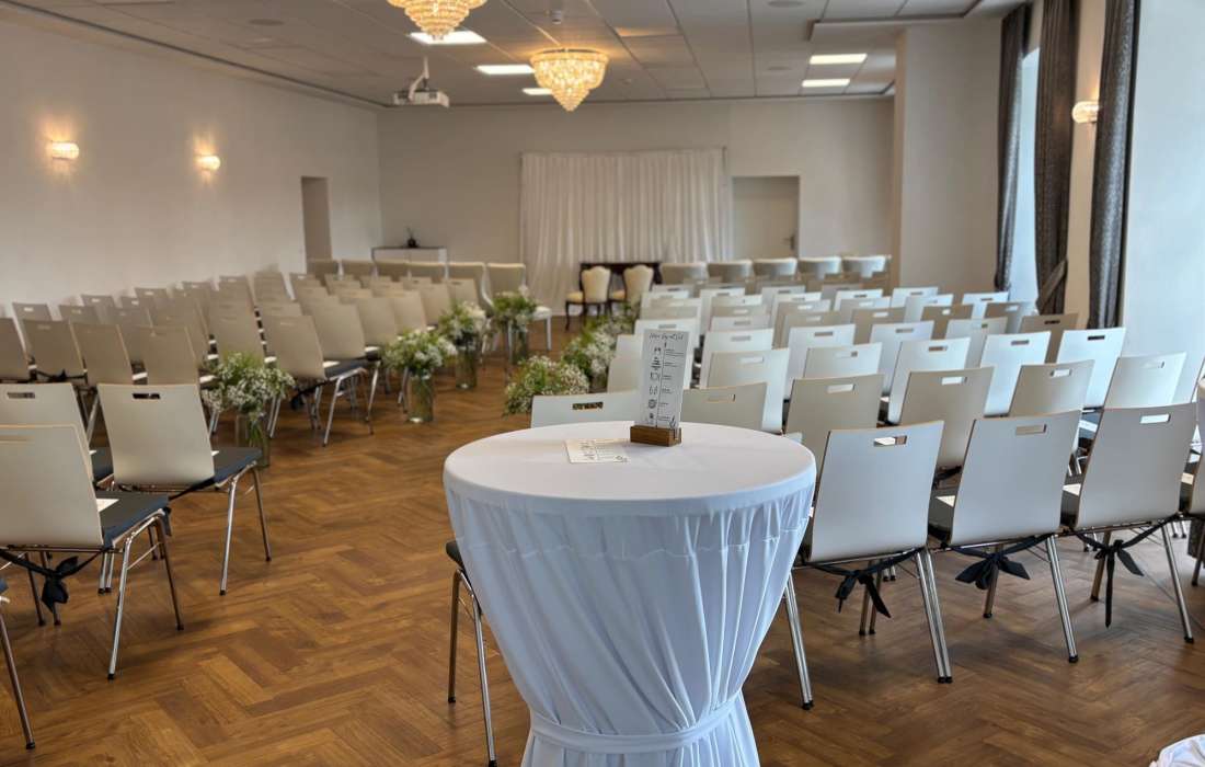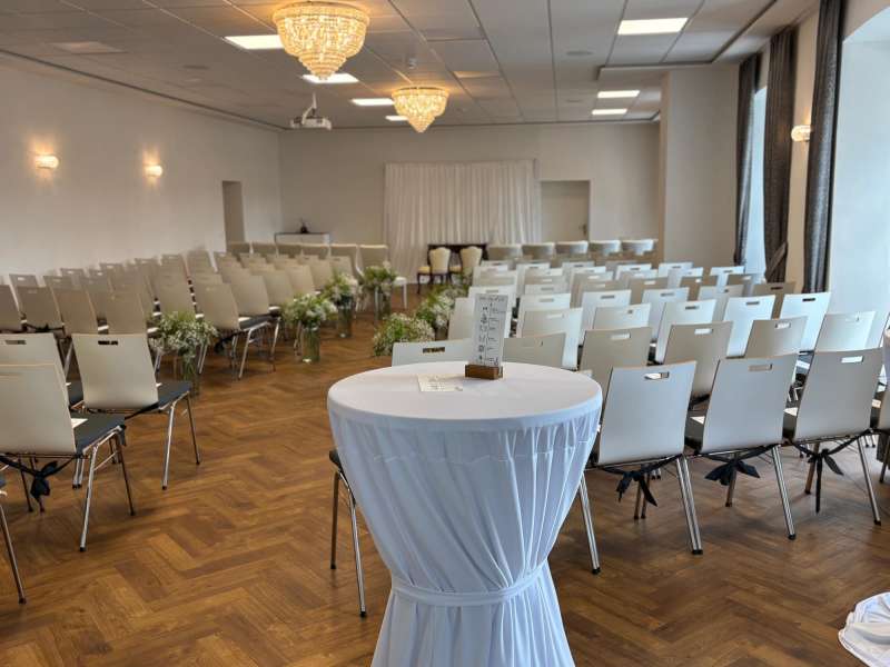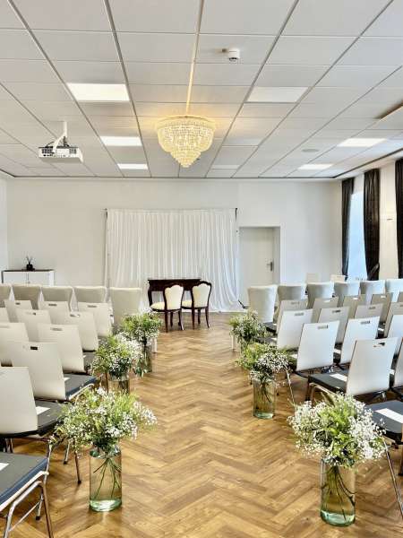 Unser Festsaal erstreckt sich über großzügige 130 Quadratmeter und bietet Platz für Ihre Hochzeitsgesellschaft. Mit seiner beeindruckenden Deckenhöhe und den opulenten Kronleuchtern schafft er eine märchenhafte Atmosphäre, die Ihre Hochzeit zu einem unvergesslichen Erlebnis macht. Die großen Fenster lassen natürliches Licht herein.