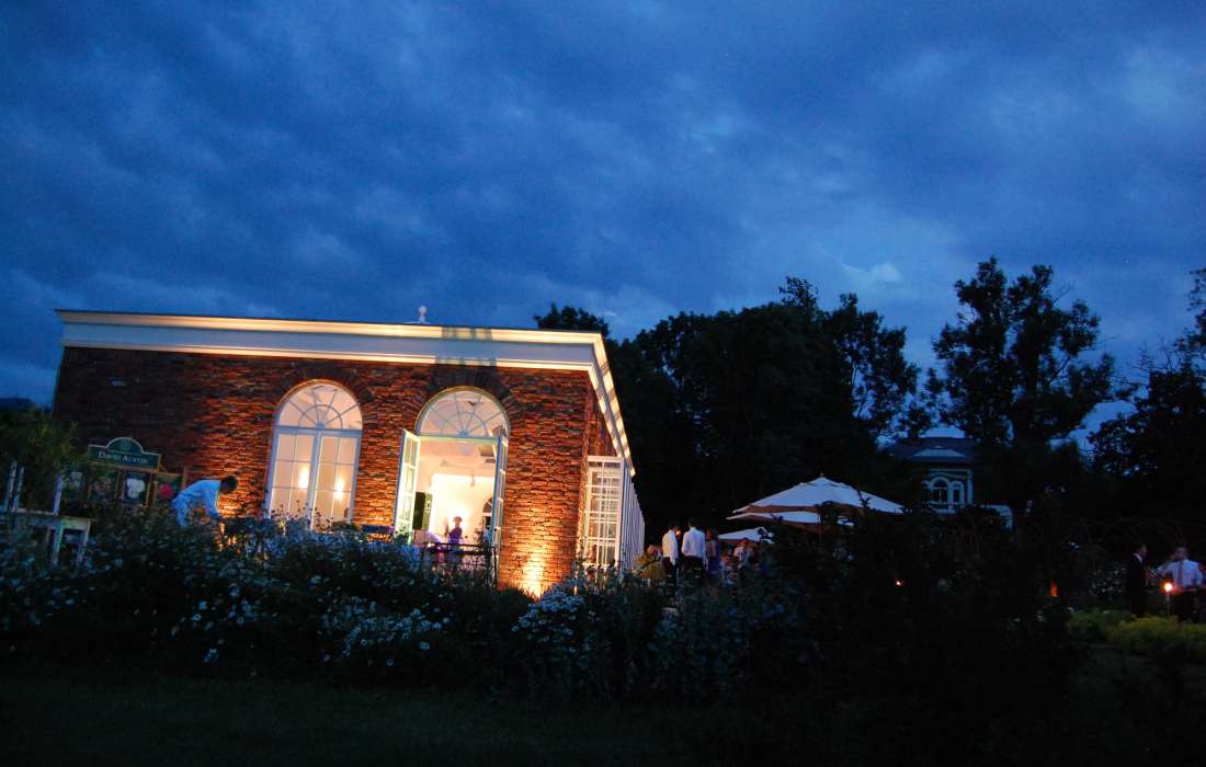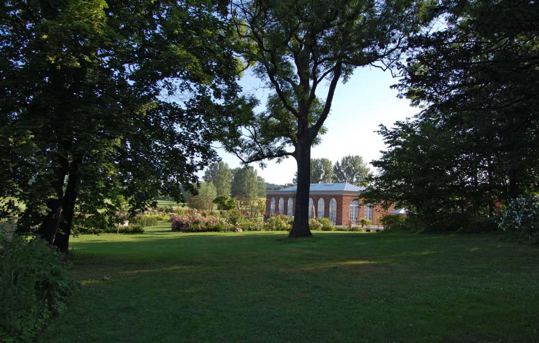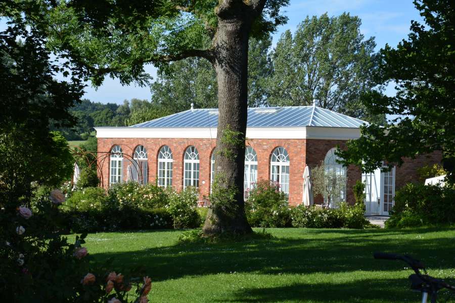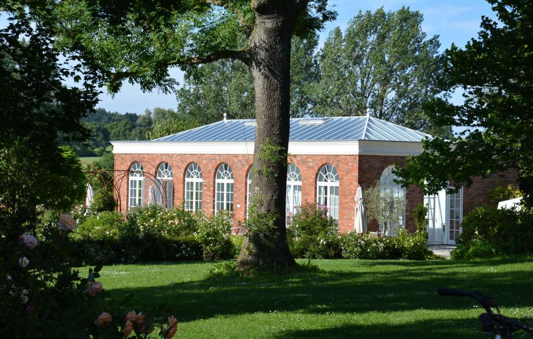 Die Orangerie kann sowohl für kleinere als auch größere Festgesellschaften bis 90 Personen komfortabel zum Feiern genutzt werden. Sie bietet einen lichdurchfluteten festlichen Rahmen mit traumhaften Ausblicken in den Rosengarten.
