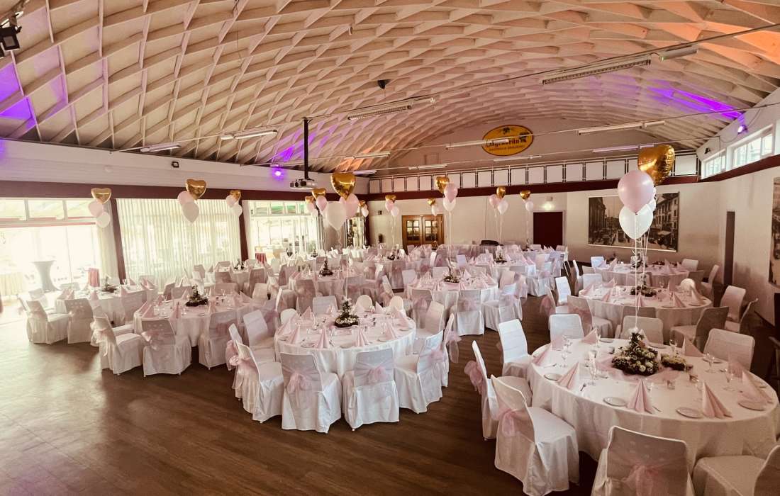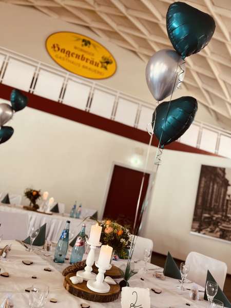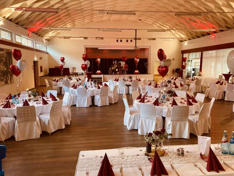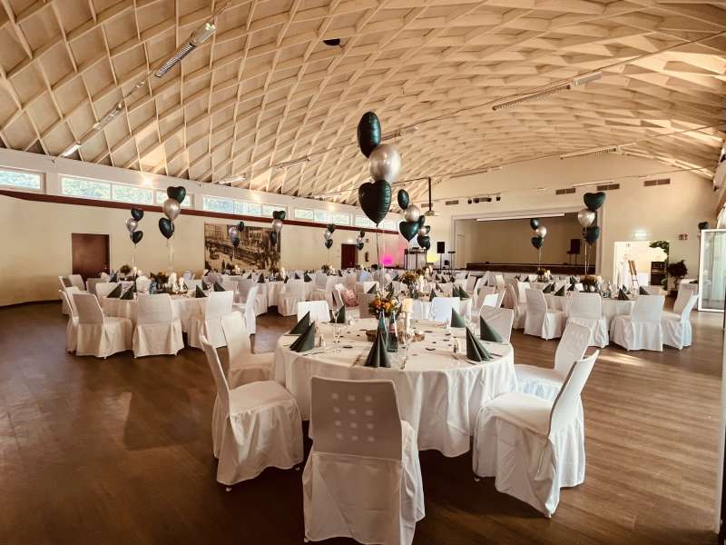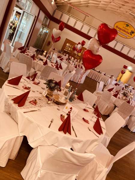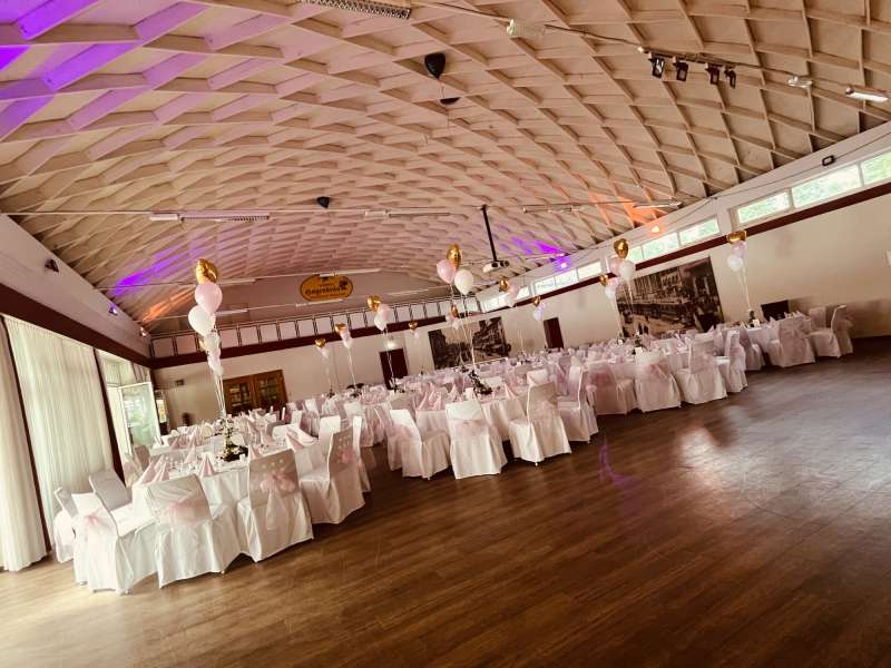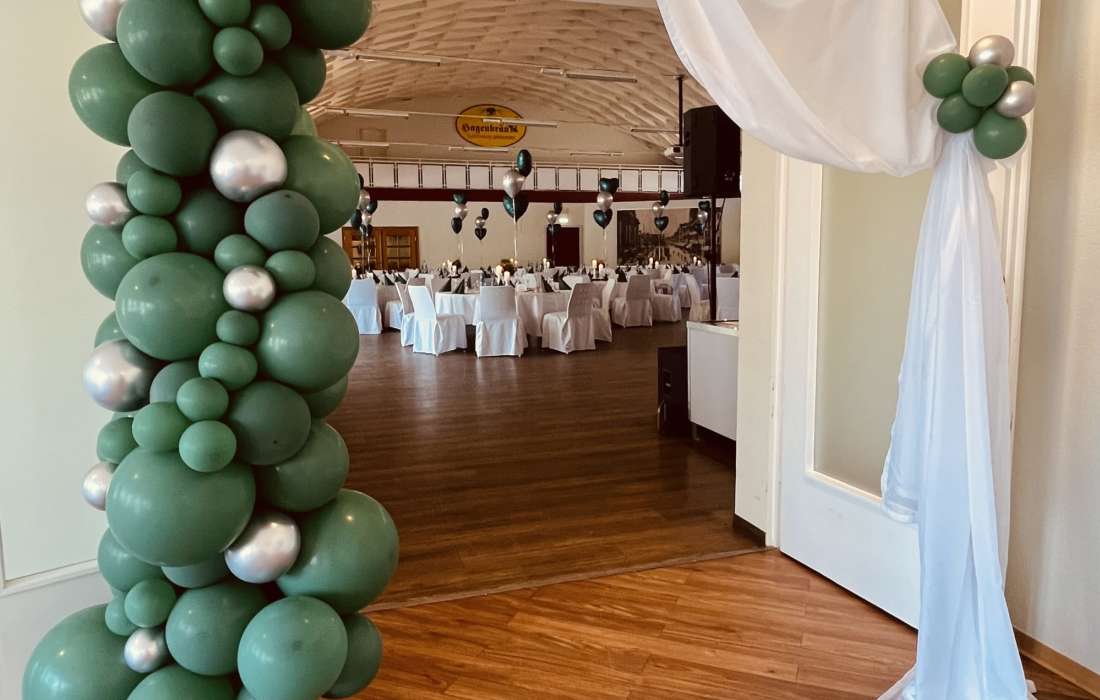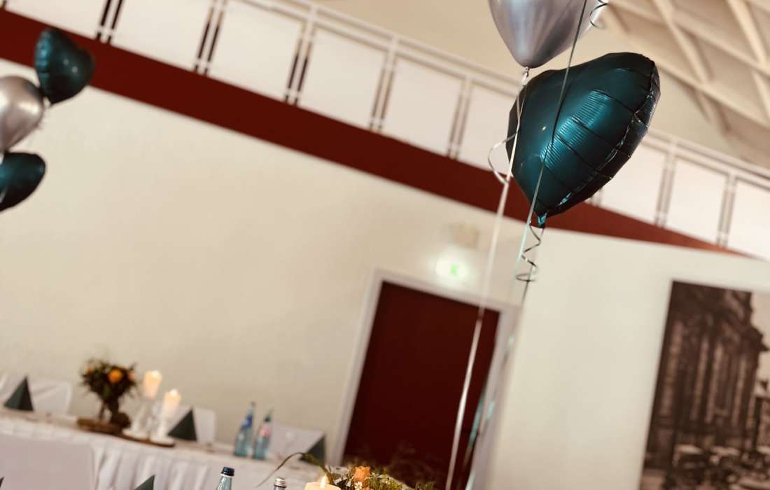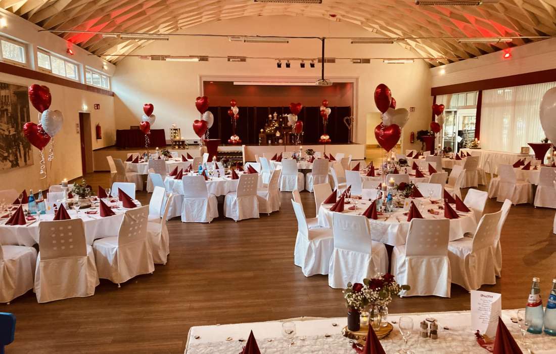 Wenn Sie sich nicht um alles selbst kümmern möchten, stehen wir Ihnen in der Planung Ihrer Feierlichkeit gerne zur Seite. Jahrelange Erfahrung und regionale Partner sorgen dafür, dass wir Ihnen ein stimmiges Gesamtkonzept ganz nach Ihren Wünschen und Anforderungen erstellen können. Neben unseren eckigen Saaltischen bieten wir auch runde Tische für eine festliche Optik an. Unsere Stühle eignen sich hervorragend für das Anbringen von Stuhlhussen, die wir über unseren Servicepartner für Sie beziehen können. Außerdem bieten wir Ihnen verschiedene, stimmige Dekorationen in Ihrer Wunschfarbe an und runden diese mit unserer Floristin durch passenden, individuellen Blumenschmuck ab. Unser Eventpartner für Licht und Musik kümmert sich gerne um die richtige, musikalische Begleitung und sorgt mit eindrucksvoller Beleuchtung für eine ganz besondere Atmosphäre. Für das gewisse Etwas sorgen Luftballons, die den Eingang zieren oder im Saal ein zusätzliches Highlight darstellen.