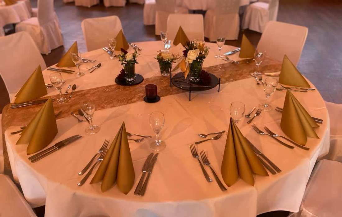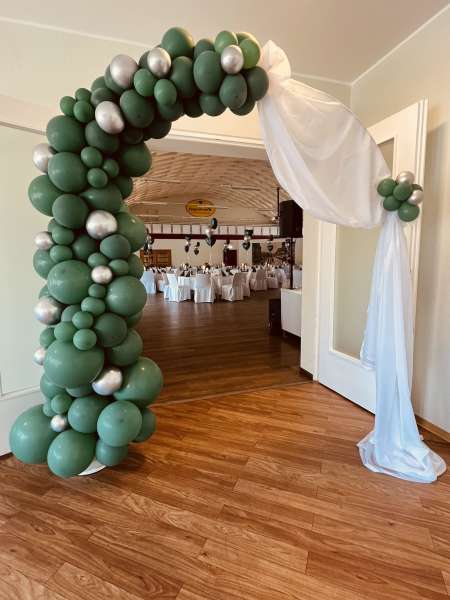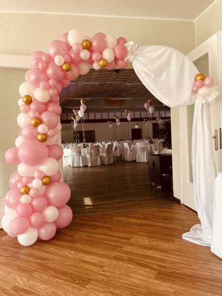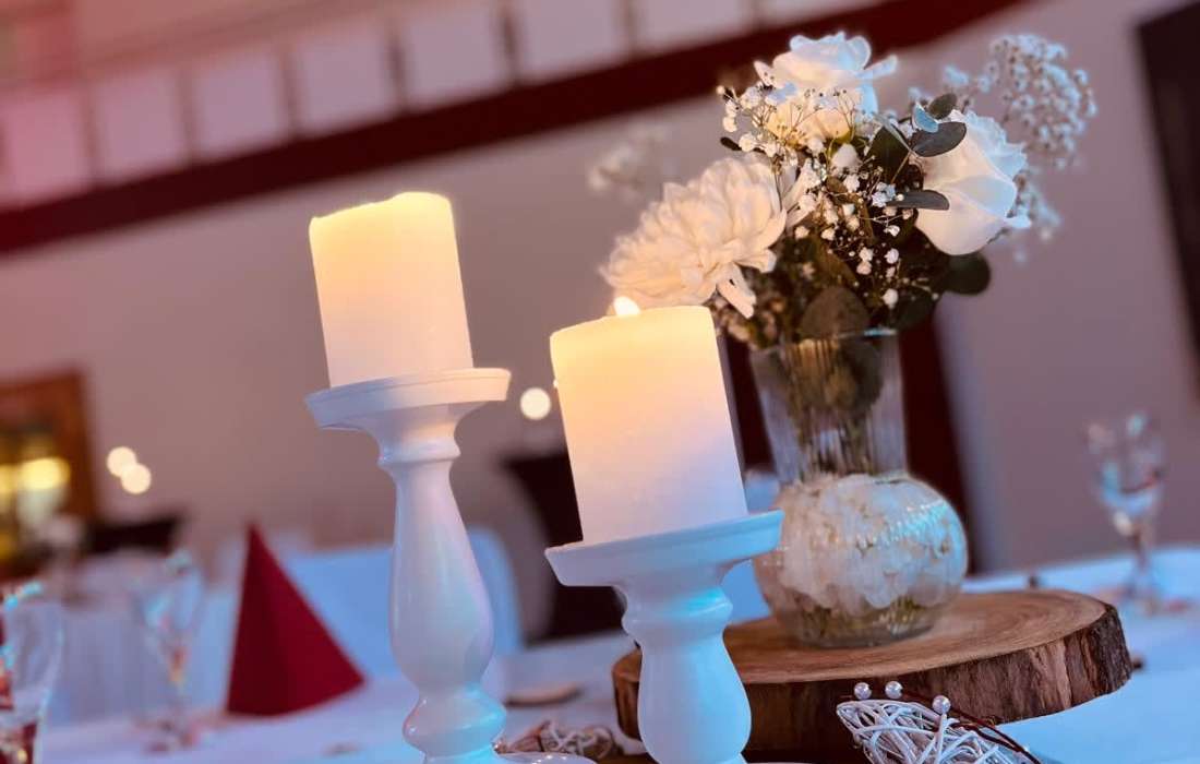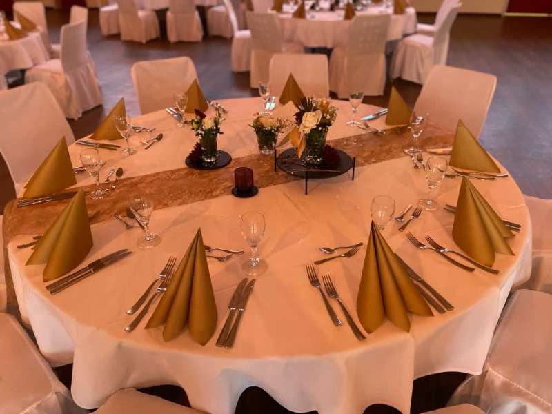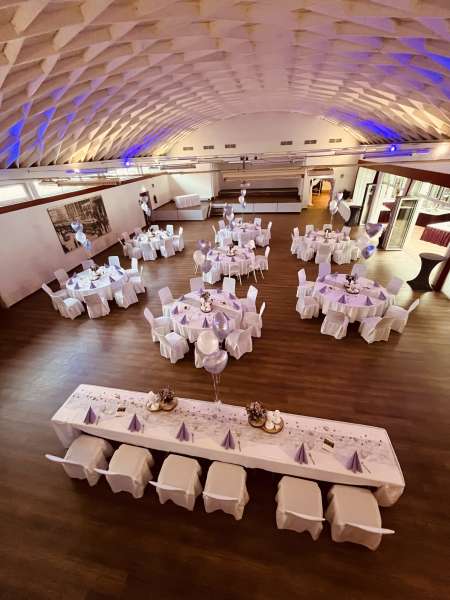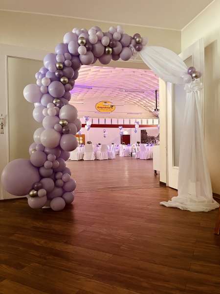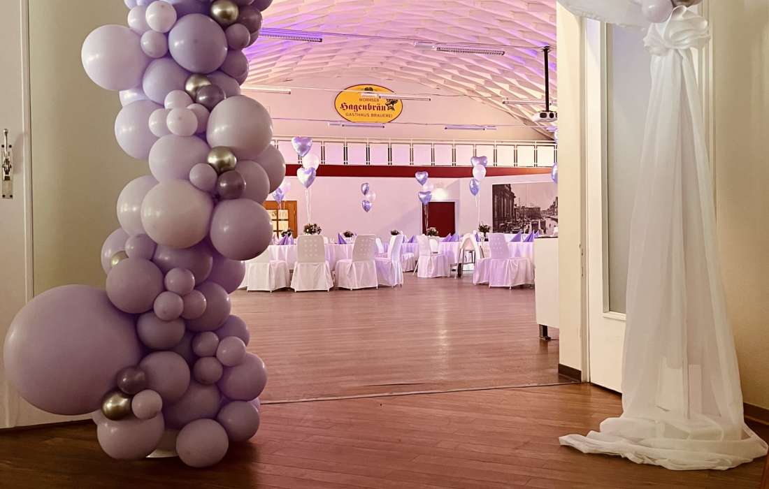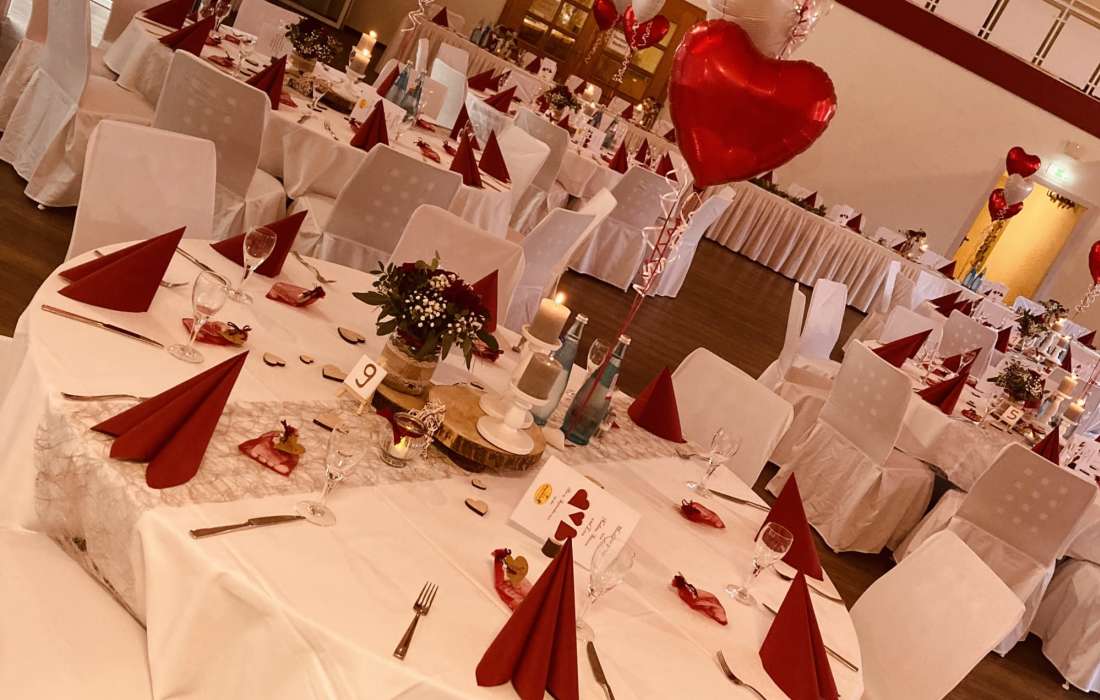 Wenn Sie sich nicht um alles selbst kümmern möchten, stehen wir Ihnen in der Planung Ihrer Feierlichkeit gerne zur Seite. Jahrelange Erfahrung und regionale Partner sorgen dafür, dass wir Ihnen ein stimmiges Gesamtkonzept ganz nach Ihren Wünschen und Anforderungen erstellen können. Neben unseren eckigen Saaltischen bieten wir auch runde Tische für eine festliche Optik an. Unsere Stühle eignen sich hervorragend für das Anbringen von Stuhlhussen, die wir über unseren Servicepartner für Sie beziehen können. Außerdem bieten wir Ihnen verschiedene, stimmige Dekorationen in Ihrer Wunschfarbe an und runden diese mit unserer Floristin durch passenden, individuellen Blumenschmuck ab. Unser Eventpartner für Licht und Musik kümmert sich gerne um die richtige, musikalische Begleitung und sorgt mit eindrucksvoller Beleuchtung für eine ganz besondere Atmosphäre. Für das gewisse Etwas sorgen Luftballons, die den Eingang zieren oder im Saal ein zusätzliches Highlight darstellen.