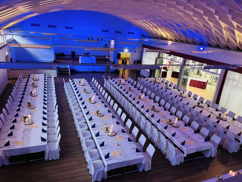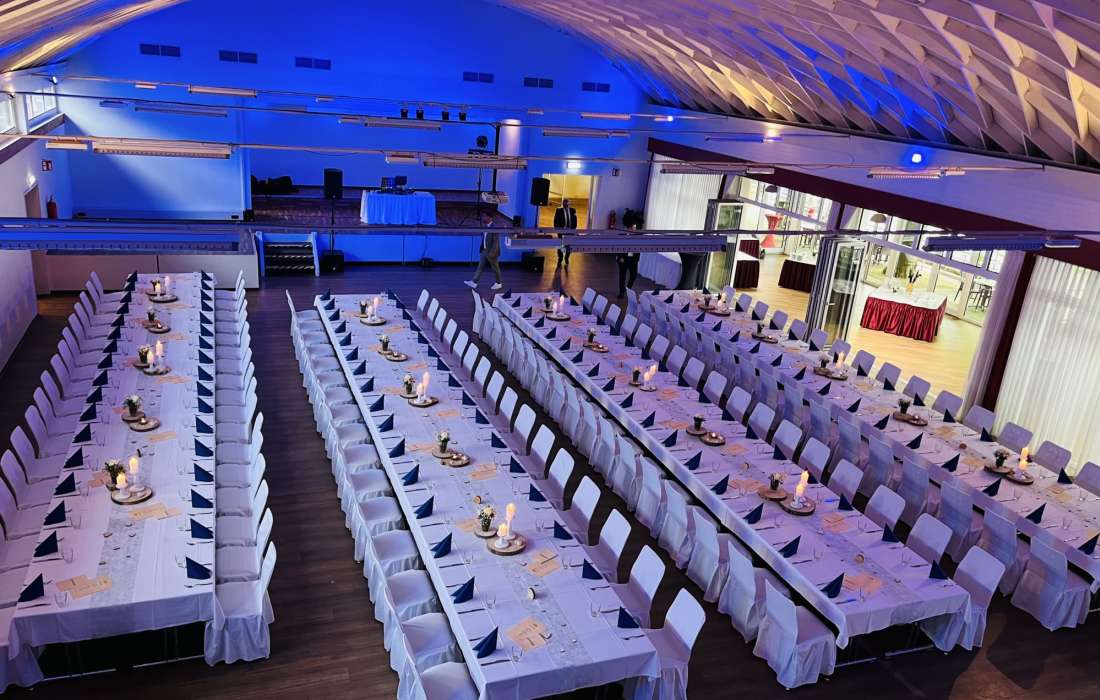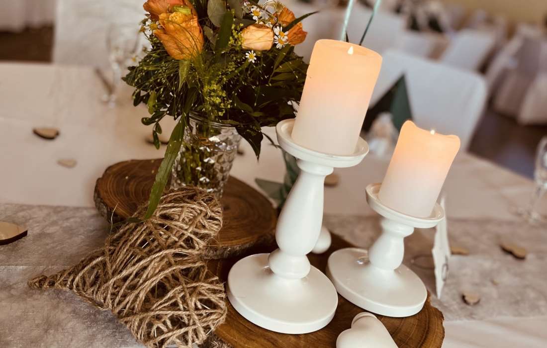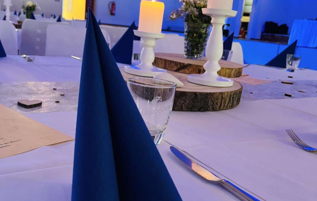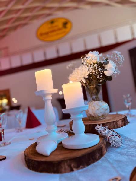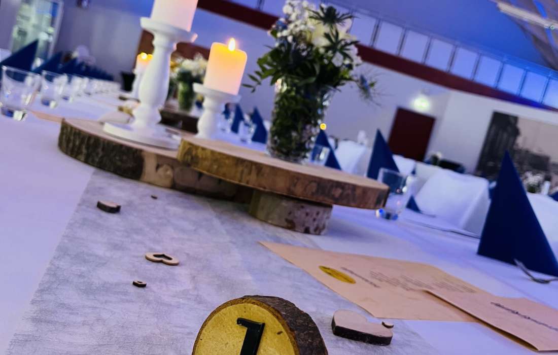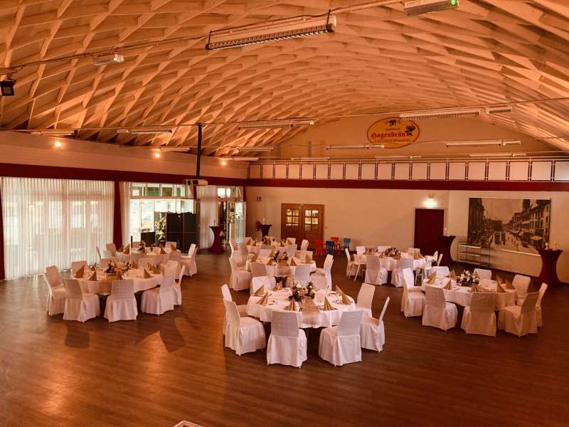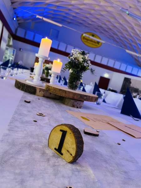 Wenn Sie sich nicht um alles selbst kümmern möchten, stehen wir Ihnen in der Planung Ihrer Feierlichkeit gerne zur Seite. Jahrelange Erfahrung und regionale Partner sorgen dafür, dass wir Ihnen ein stimmiges Gesamtkonzept ganz nach Ihren Wünschen und Anforderungen erstellen können. Neben unseren eckigen Saaltischen bieten wir auch runde Tische für eine festliche Optik an. Unsere Stühle eignen sich hervorragend für das Anbringen von Stuhlhussen, die wir über unseren Servicepartner für Sie beziehen können. Außerdem bieten wir Ihnen verschiedene, stimmige Dekorationen in Ihrer Wunschfarbe an und runden diese mit unserer Floristin durch passenden, individuellen Blumenschmuck ab. Unser Eventpartner für Licht und Musik kümmert sich gerne um die richtige, musikalische Begleitung und sorgt mit eindrucksvoller Beleuchtung für eine ganz besondere Atmosphäre. Für das gewisse Etwas sorgen Luftballons, die den Eingang zieren oder im Saal ein zusätzliches Highlight darstellen.