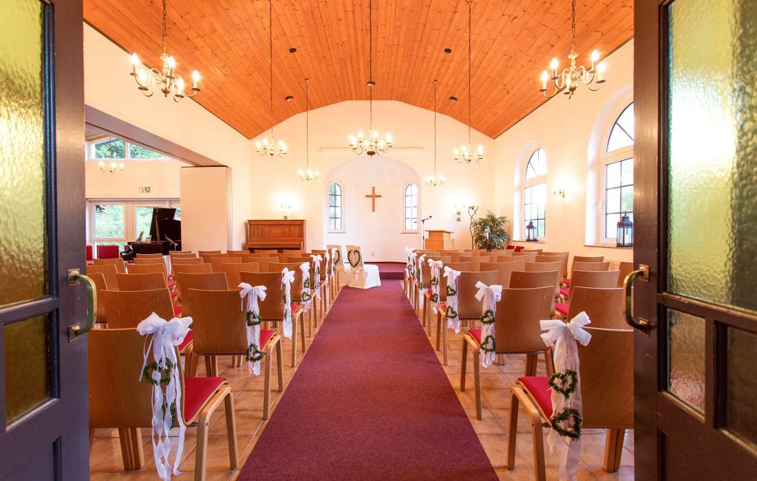 In unserer eigenen Kapelle können Sie sich bei einer freien Zeremonie in Anwesenheit Ihrer Familien und Freunden ganz romantisch das Ja-Wort geben. In unserer weitläufigen Parkanlage finden Sie schließlich viele schöne Motive, um Ihre ganz persönlichen Andenken an Ihren großen Tag in Bildern festzuhalten. Gern bereiten wir Ihnen unsere Festhalle für eine ausgelassene Hochzeitsfeier vor. Wir bestuhlen den Raum ganz nach Ihren Wünschen. Gern können Sie auch Ihre eigenen Deko-Ideen einfließen lassen. In der Festhalle befindet sich eine große Bühne, auf der nicht nur der DJ seinen Platz finden kann, sondern auch besondere Aufführungen stattfinden können.