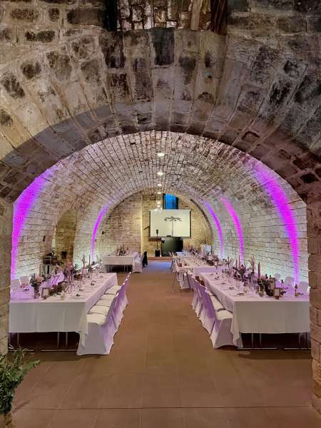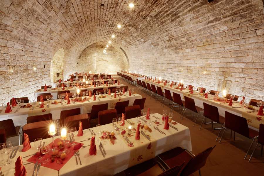 - Gewölbekeller: bis zu 120 Personen. Einen unserer Gewölbekeller im Wirtschaftstrakt haben wir für größere Veranstaltungen ausgebaut. Der Dionysos-Keller bietet sich für das Menü im Rahmen von Familienfeiern, Hochzeiten, Firmenjubiläen, Betriebsausflügen oder Tagungen an.