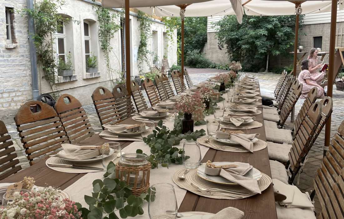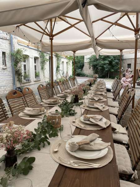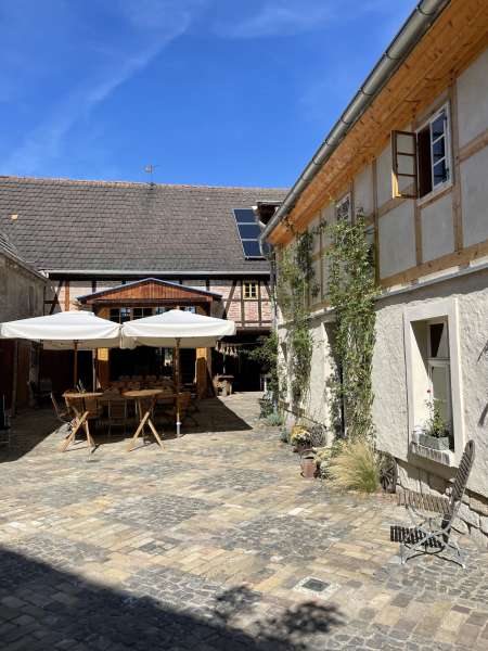 • Im Innenhof können weitere Tische und Stühle für ca. 50 Personen aufgestellt werden. Bei hohen Temperaturen stehen Sonnenschirme und bei ungemütlichem Wetter ein Zelt zur Verfügung.