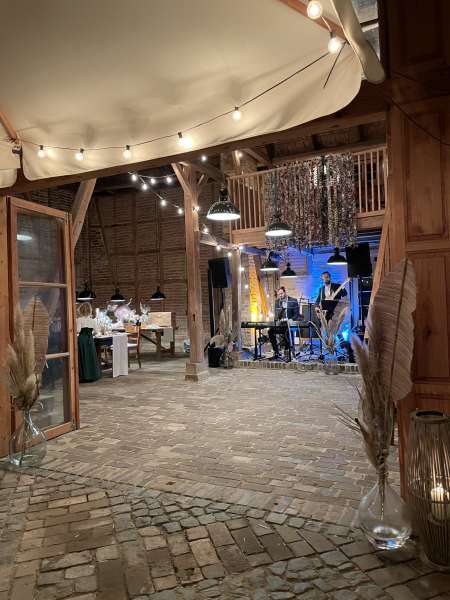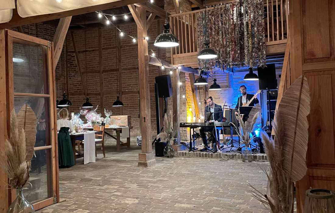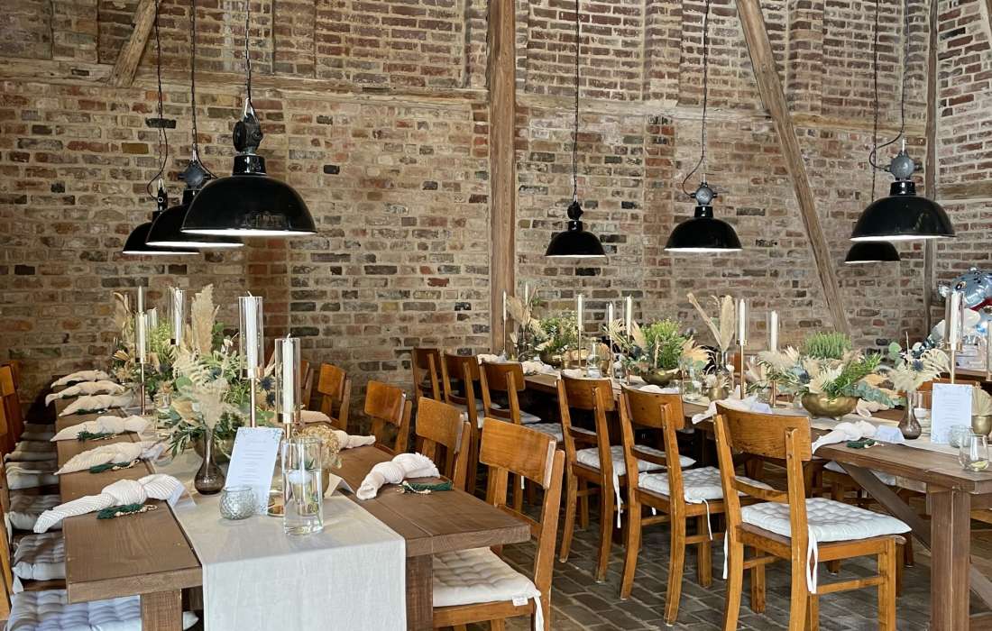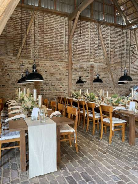 • Eine Scheune mit Tischen und Stühlen für 50–60 Gäste