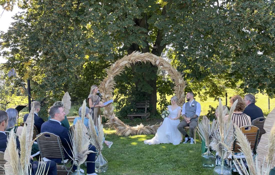 Feiert eure Trauzeremonie mit all euren Gästen auf der großen Obstbaumwiese und gebt euch das Ja-Wort unter der alten, romantischen Linde. Auch eine kirchliche Trauung ist hier unter freiem Himmel möglich. Die Kirche selbst liegt übrigens in direkter Nachbarschaft zu Herberts Hof und kann ebenfalls für eure Trauung genutzt werden.