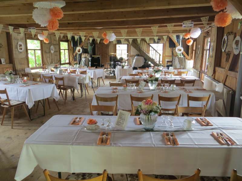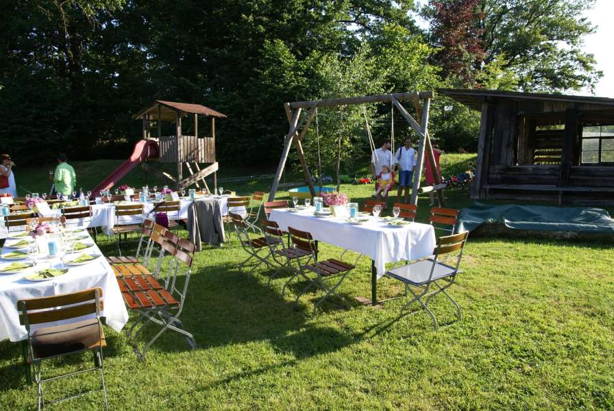 Auf unserem idyllischen, verträumten Festgelände mit angrenzendem Mühlbach und Spielwiese, weit ab von Lärm und Hektik, kommen große und kleine Leute auf Ihre Kosten.