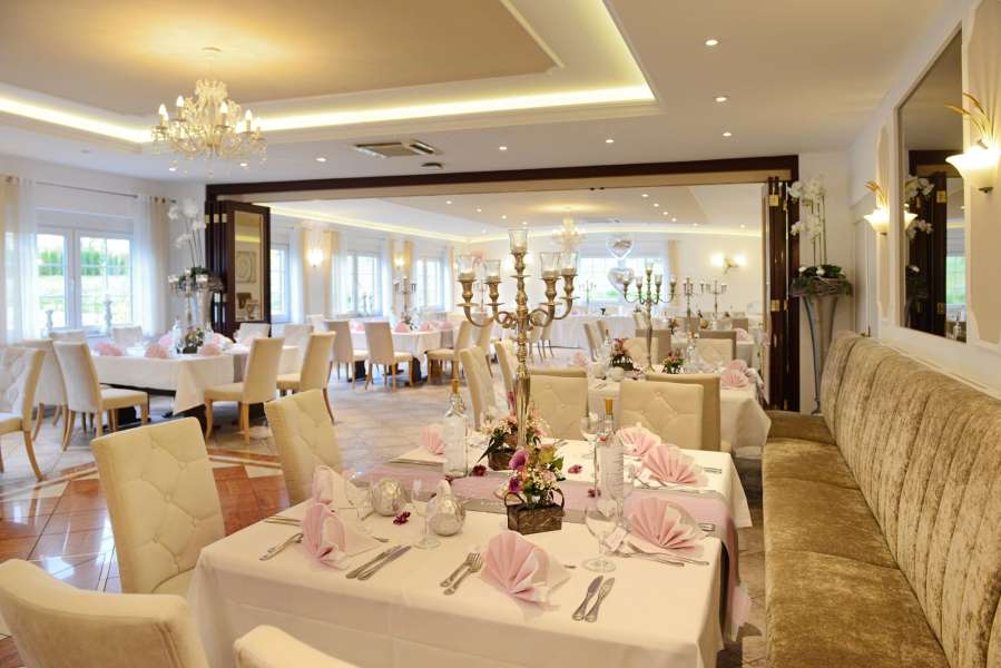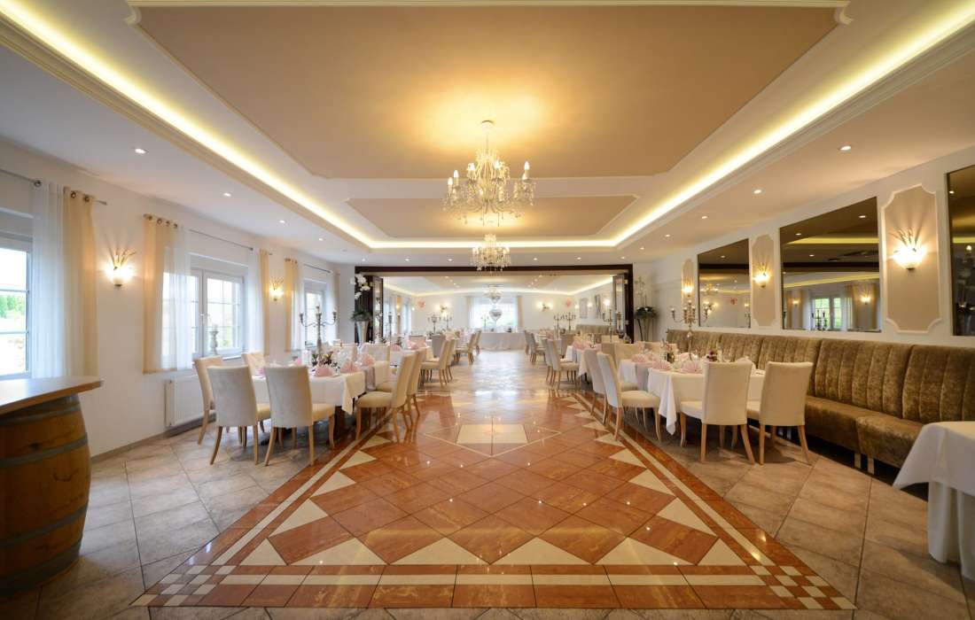 Der voll klimatisierte Festsaal bietet eine Tanzfläche, Leinwand, kleine Musikanlage, dimmbare Spots, eine farblich an Ihre Deko angepasste LED Beleuchtung und vieles Mehr. Die ideale Gästezahl ist 50 bis 150 Personen.