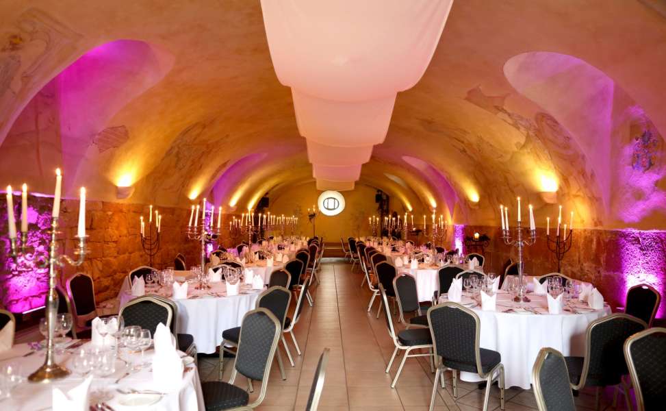 Schloss Edesheim, eingebettet in einem über 5ha großen Park mit Weinbergen und Wasseranlagen, ist eine Oase der Ruhe und des Genießens. Ein einzigartiges historisches Ambiente in Verbindung mit der persönlichen Atmosphäre des Hauses garantiert einen unvergesslichen Aufenthalt. Kulinarisch wird man in diesem historischen Gebäude mit einer marktfrischen, mediterranen Küche und erlesenen Weinen aus der Pfalz verwöhnt, welche im eleganten Gourmet-Restaurant serviert werden. Für Hochzeitsgäste bilden die historischen Säle und Gewölbekeller den idealen Rahmen für einzigartige Festlichkeiten. In Verbindung mit der persönlichen und professionellen Beratung ist sichergestellt, dass jede Hochzeit zu einem Ereignis wird. Vom lockeren Sektempfang mit Fingerfood im Schlosspark bis zum mehrgängigen Galadinner mit hochwertigem Unterhaltungsprogramm ist in Schloss Edesheim alles möglich. In der stilvollen Atmosphäre des Ballsaales, Churpfalzsaales sowie des Wittelsbachkellers, mit direktem Zugang zum Schlosspark, serviert die aufmerksame Servicebrigade festliche Menüs oder Büffets für bis zu 120 Personen aus der mehrfach ausgezeichneten, mediterranen Schlossküche. Für Brautpaare besteht sogar die Möglichkeit sich im besonderen Ambiente des Ballsaals standesamtlich trauen zu lassen, da das Schloss zudem noch eine offizielle Nebenstelle des Standesamtes der Verbandsgemeinde Edenkoben beherbergt. Bei der Planung und Durchführung Ihrer Veranstaltung werden Sie von Anfang bis Ende professionell betreut und beraten, so dass Sie Ihrer Feierlichkeit beruhigt entgegensehen können. Die Mitarbeiter kümmern sich auf Wunsch um die richtige musikalische Begleitung, die Tisch- und Raumdekoration, Menükarten, Tischkarten und Rahmenprogramme.
