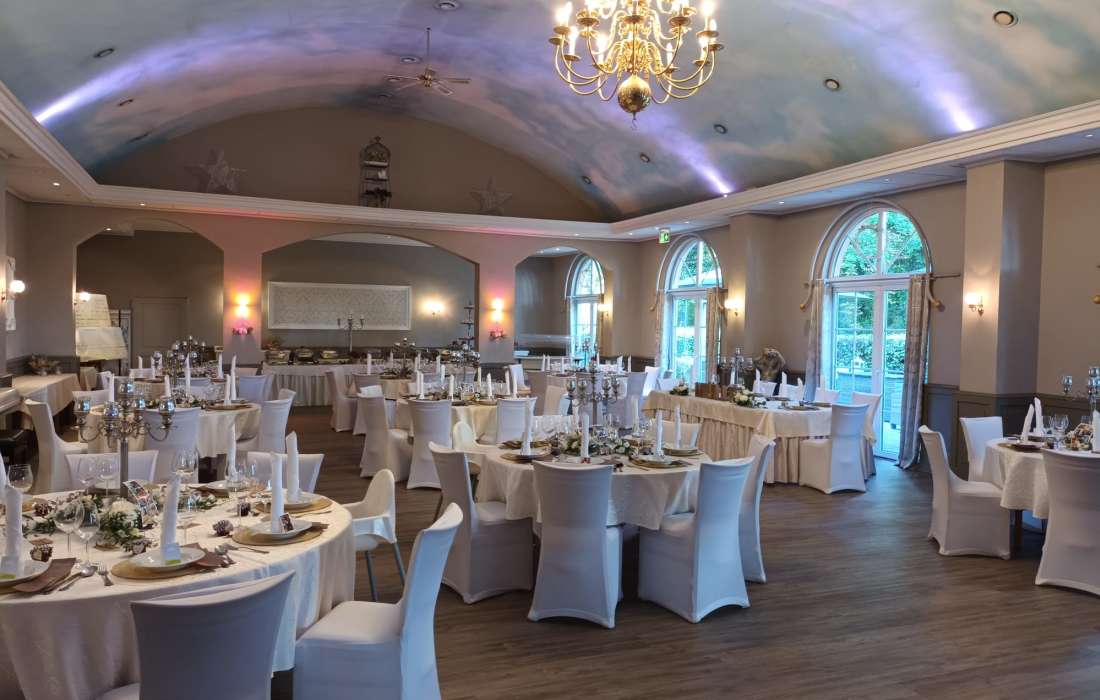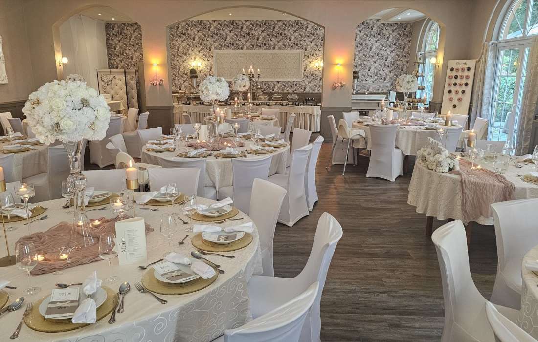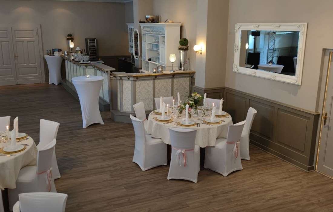 Unser großer Veranstaltungssaal "Schloßterrasse" bietet Platz für bis zu 250 Gäste und ist der ideale Ort für Ihre Traumhochzeit. Ob als Hochzeitssaal oder für andere festliche Anlässe wie Geburtstage, Jubiläen oder Betriebsfeiern – hier wird jede Feier zu einem besonderen Erlebnis.