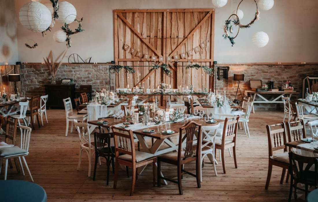 Unsere Eventscheune ist geeignet von 35 bis zu 120 Personen mit festen Sitzplätzen und einer zusätzlichen Tanzfläche.