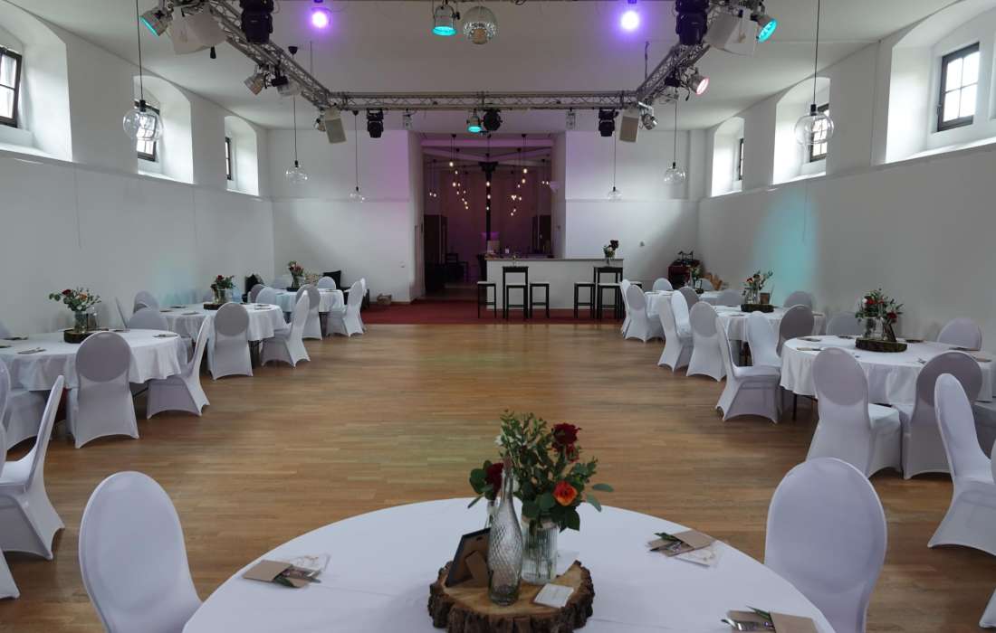 Unsere flexible Raumgestaltung erlaubt es, den Saal ganz nach Ihren Wünschen zu gestalten – ob für eine feierliche Tafel oder einen großen Tanzbereich. Dazu bieten wir Ihnen 150 komfortable Sitzplätze und Tische an, die je nach Eventkonzept arrangiert werden können.