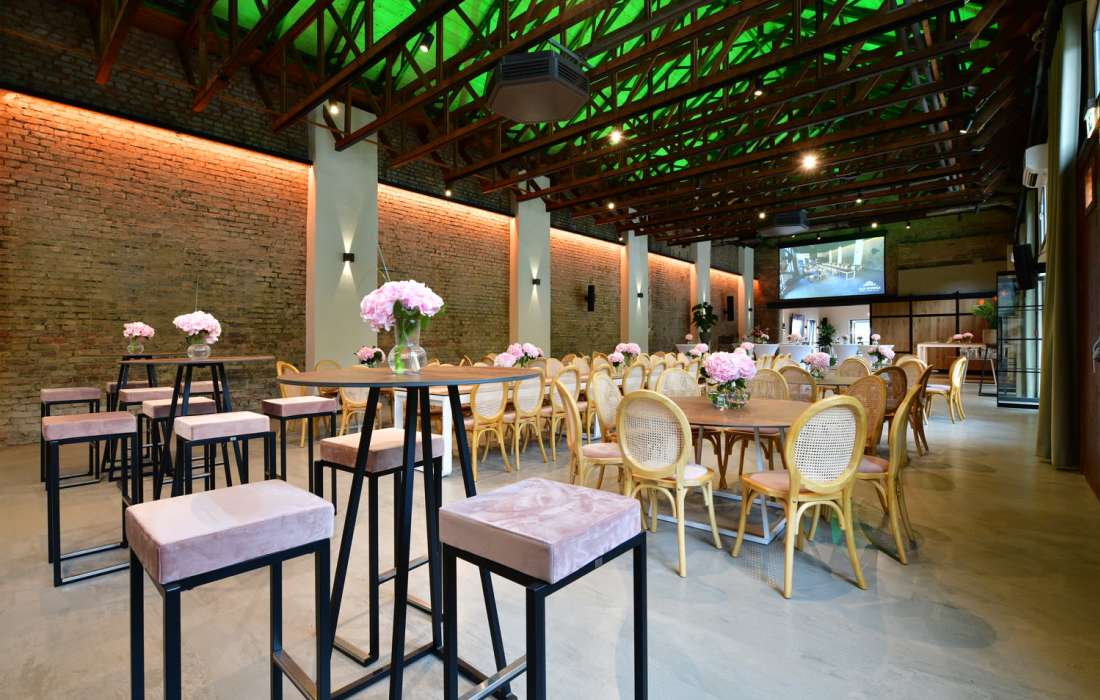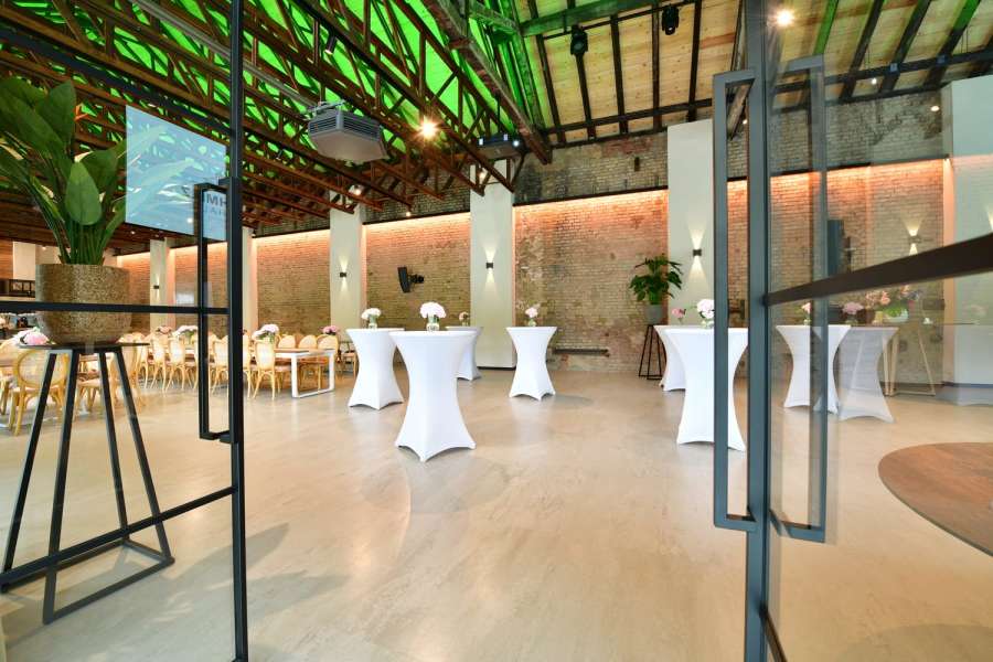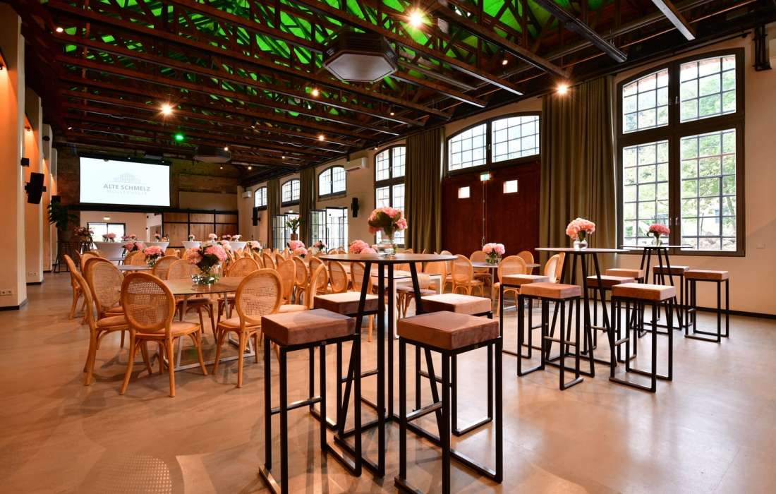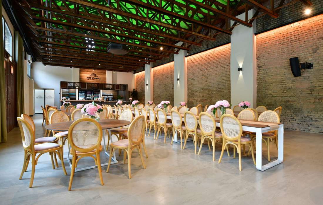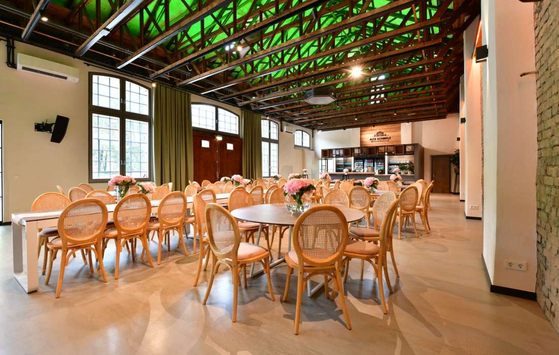 Unsere denkmalgeschützte Möllerhalle auf dem Gelände der Alten Schmelz bietet einen einzigartigen Rahmen für Veranstaltungen jeder Art – von Geburtstagen über Hochzeiten bis hin zu geschäftlichen Feiern. Mit ihrem industriellen Charme und der beeindruckenden Architektur ist unsere Halle ein ganz besonderes Erlebnis. Moderne Ausstattung und flexible Raumgestaltung machen die Möllerhalle zur perfekten Location für unvergessliche Events.