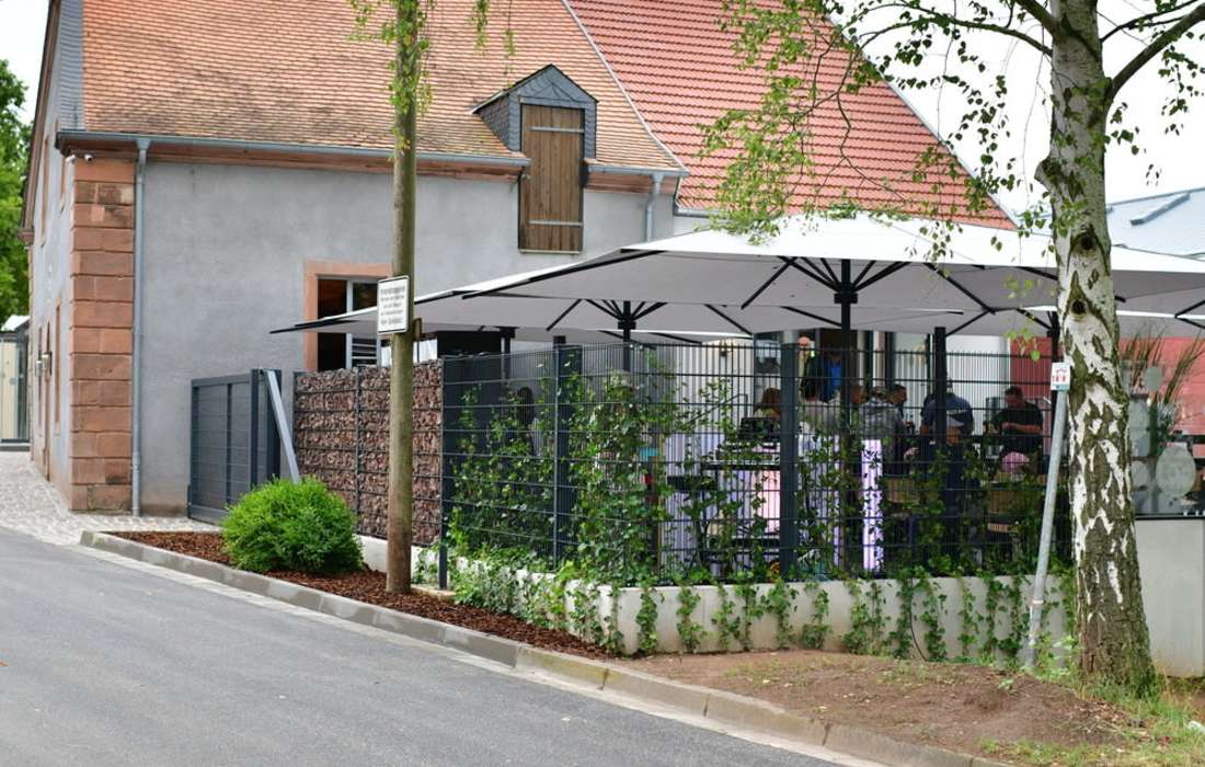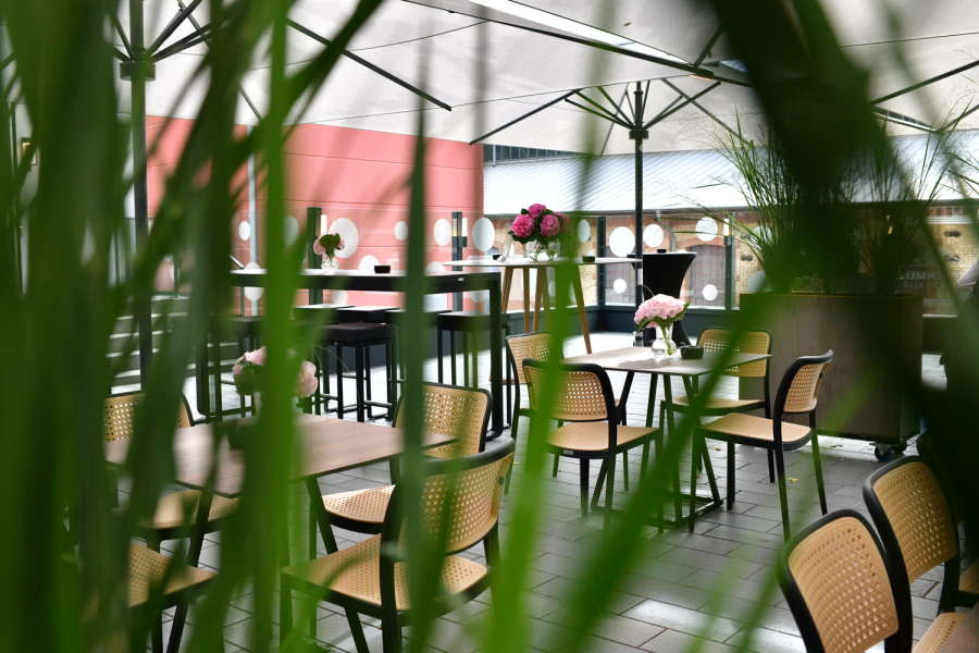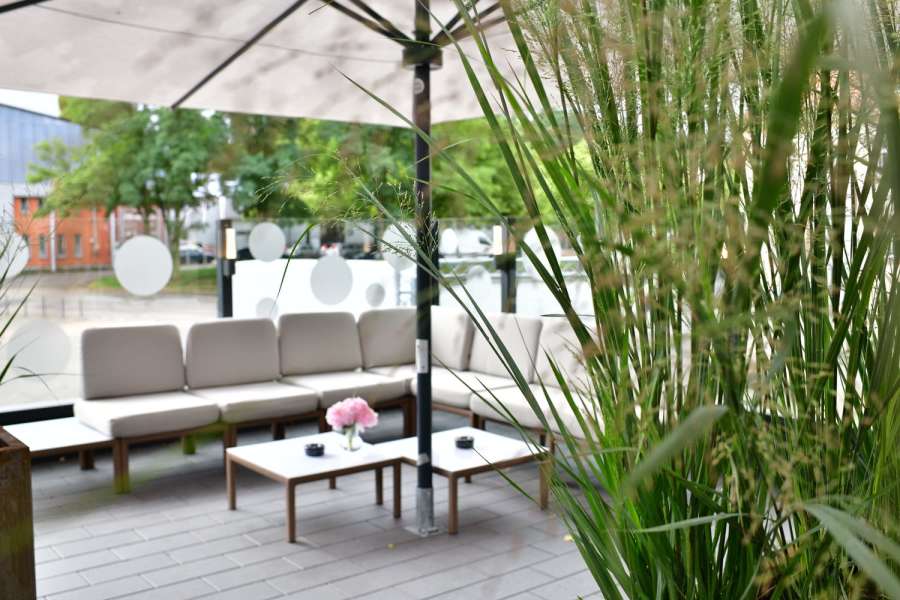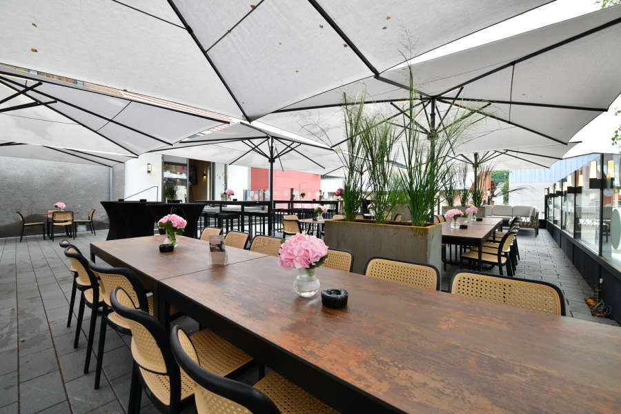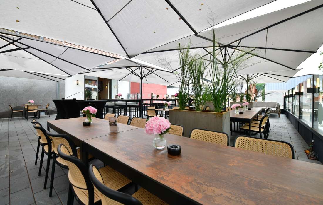 Das absolute Highlight ist unsere Panoramaterrasse: Sie bietet nicht nur viel Platz, sondern ist dank Schirmen mit integrierten Regenrinnen auch bei Regen bestens nutzbar. Hier gestalten wir gerne mit Ihnen einen stilvollen Sektempfang oder integrieren auf Wunsch eine zusätzliche Theke.