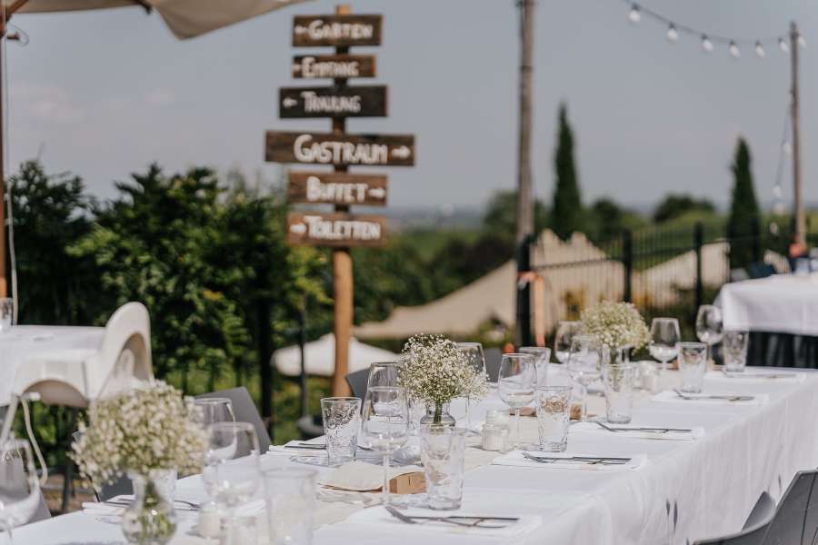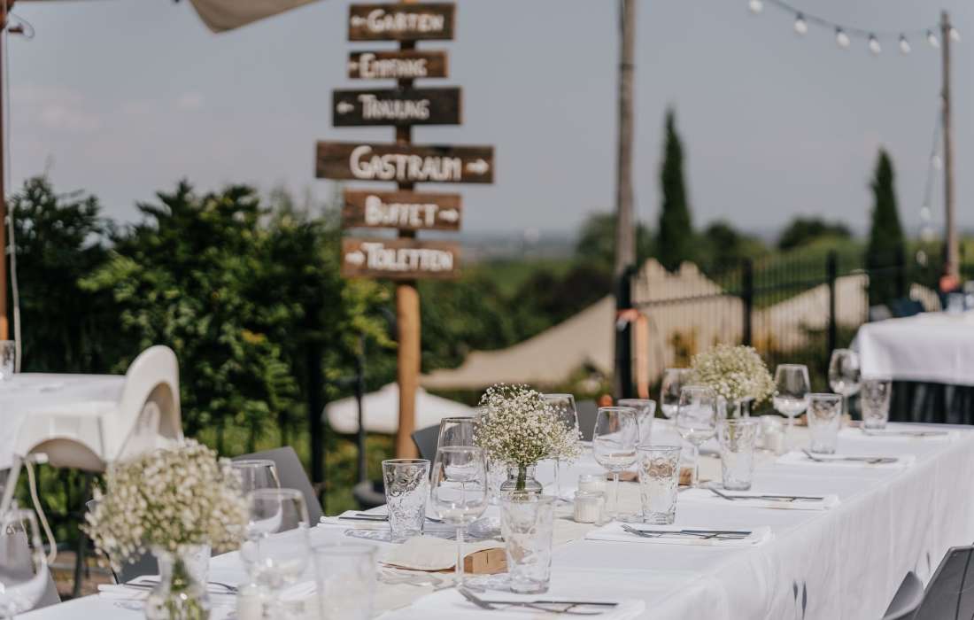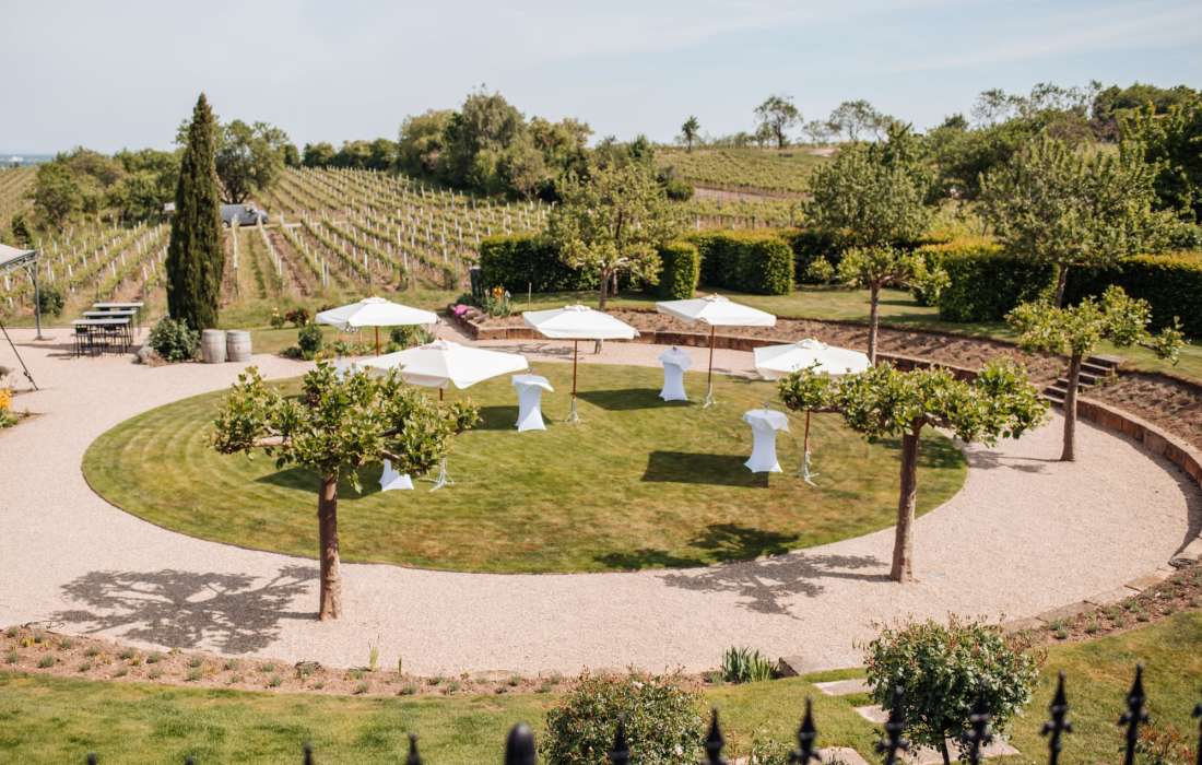 Mitten in den Pfälzer Weinbergen stehen und den Ausblick auf die Rheinebene genießen. Der besonders angelegte Garten im Netts lädt zu einem erfrischenden Getränk zur Begrüßung ein und dient auch ausgezeichnet als einmalige Location für eine Trauung mitten im Grünen.