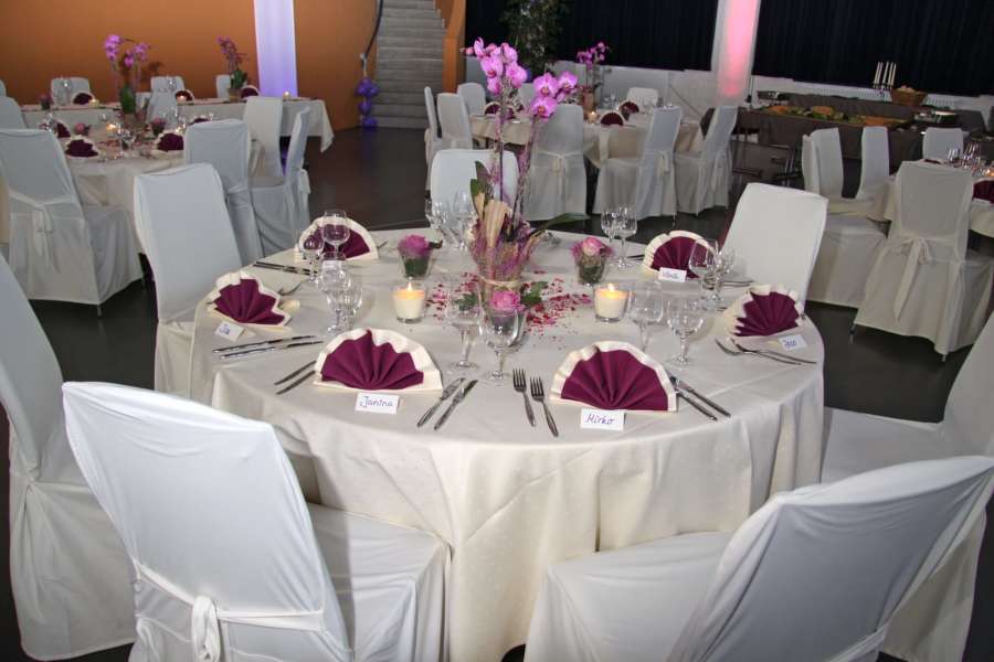 Damit Sie in stimmungsvoller Atmosphäre Ihr Fest genießen können, leuchten wir den Saal mit Schein- werfern nach Ihren Wünschen farbig aus. Vom Haus aus stehen Grünpflanzen zur erfügung. Weitere Dekoration können Sie gemäß den Vorgaben der gültigen Versammlungsstättenverordnung für Baden-Württemberg selbst vornehmen.