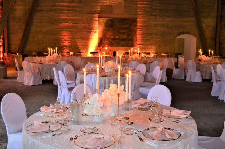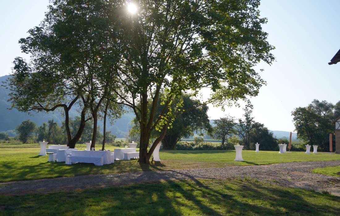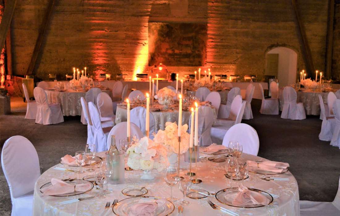 Ideal für 80 bis 180 Personen, egal ob an runden oder eckigen Tischen, mit Buffet oder gesetztem Esssen. Hier steht alles bereit. Eine Liste guter Caterer kann empfohlen werden.