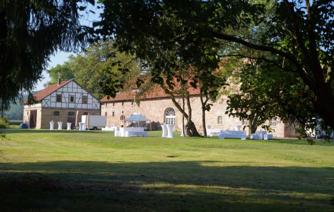 Eventscheune inmitten großräumiger Schlossanlage an der Werra mit Patronatskirche, Standesamt, Park und großem Innenhof, Bar, Tanzfläche, Cateringküche