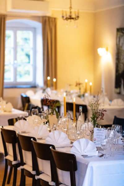 Am Abend nehmen Sie dann das Hochzeits-Dinner in Bio-Qualität in dem wunderschön dekorierten Hochzeitssaal ein und gehen danach nahtlos über zu einer unvergesslichen Party im Tangosaal.