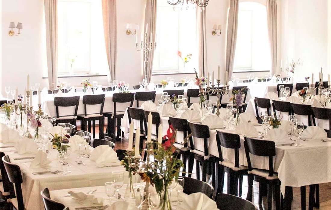 Unsere Säle sind für bis zu ca. 100 Personen ausgelegt. Das Rosenzimmer hat 50 Sitzplätze.